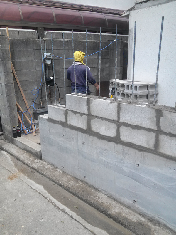高松市 O様 外壁リフォーム 平成25年7月に香川県高松市宮脇町にて古くなった木造物置部分を解体後、ブロック塀新設工事および勝手口ドアの設置工事をさせて頂きました。 型枠・コンクリート打設 ブロック基礎部分の型枠を組み上げてからのコンクリート打設状況です。 コンクリート打設完了後ブロックをついていきました。 ブロック積み 家のすぐそばを鉄道が走っていますので振動対策として鉄筋も1ランク太いものをチョイスし、差し込みピッチも狭く取りました 協力会社は高松市の藤原建業さんにてお願い致しました。 2017年10月20日工事実績コンクリート工事,ブロック塀工事