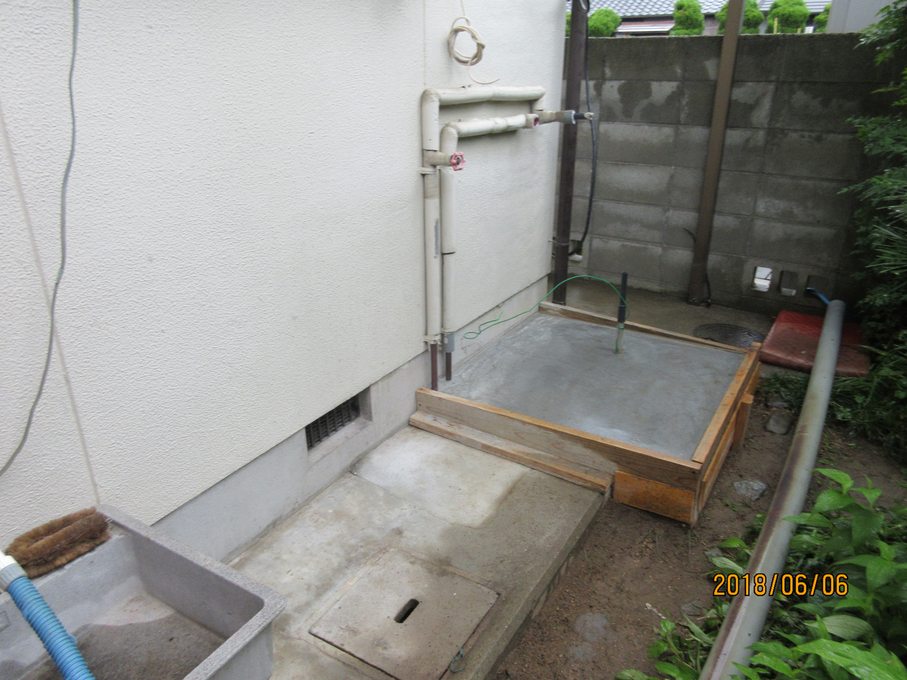 エコキュートは容量にもよって変わりますが500L前後の水を貯める構造の為、本体を据付けるコンクリートの土間(ベース)を新設します。。