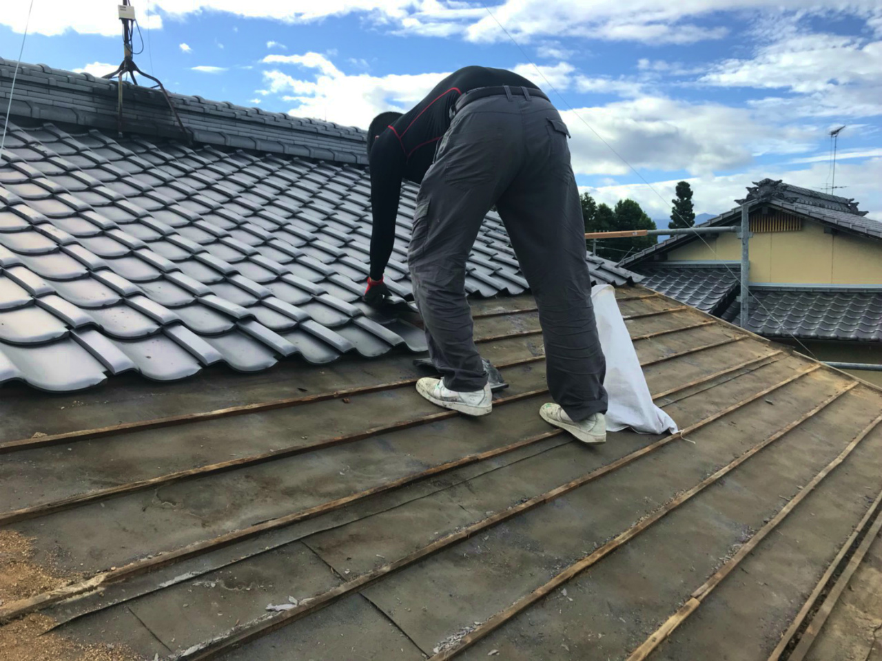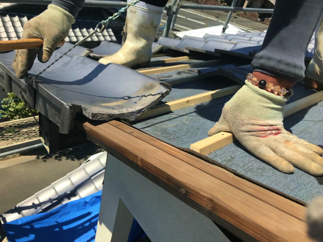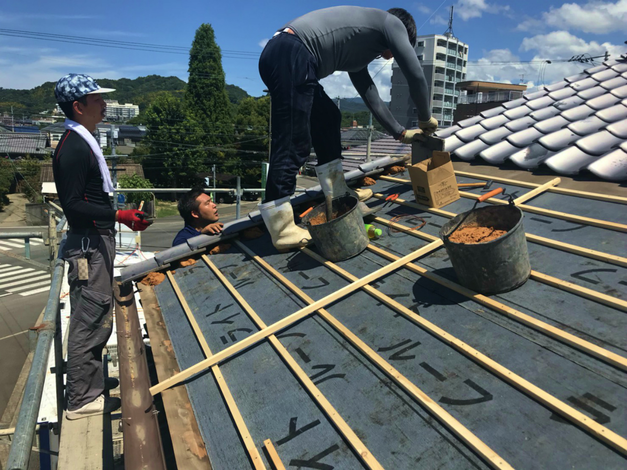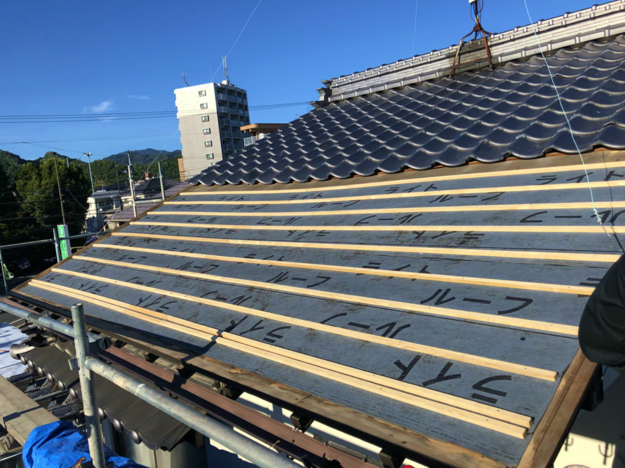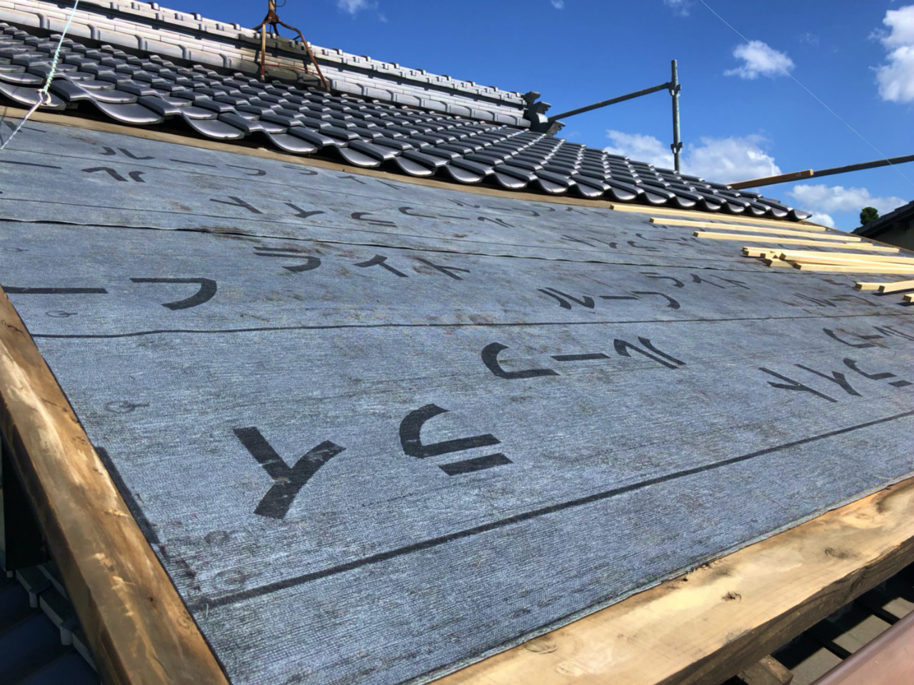 屋根の下地の上に瓦から漏れてきた雨水を家に侵入させないようにルーフィング(防水シート)を敷きます。その上に瓦を固定する横桟木を設置します。