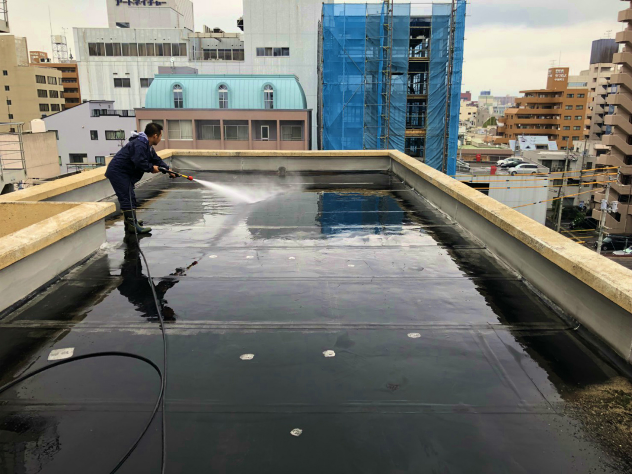 防水シート・笠木部分 高圧洗浄中