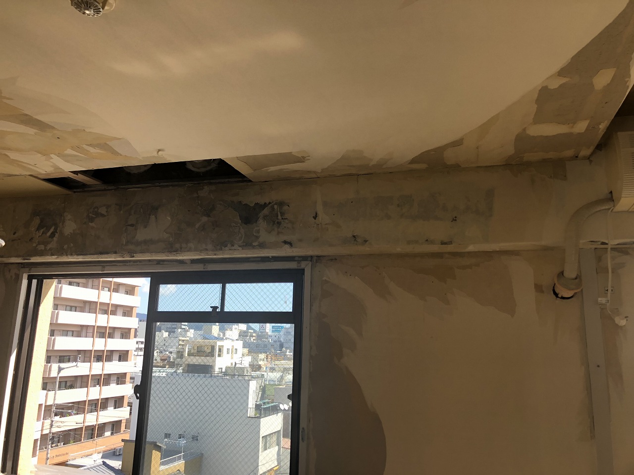 既存のクロスを全て撤去し、雨漏りの特に酷い部分は開口を空けて下地の補修を行いました。