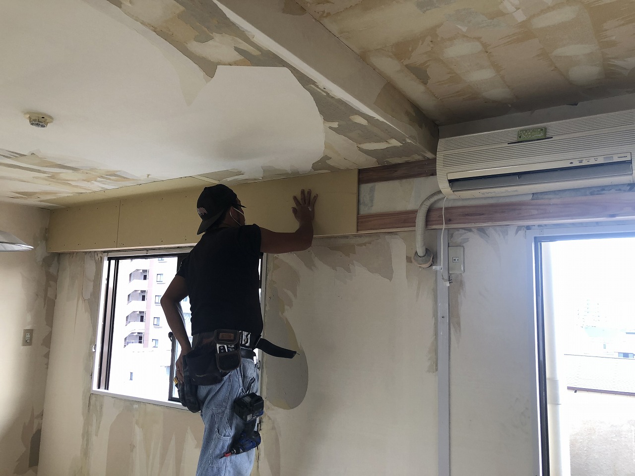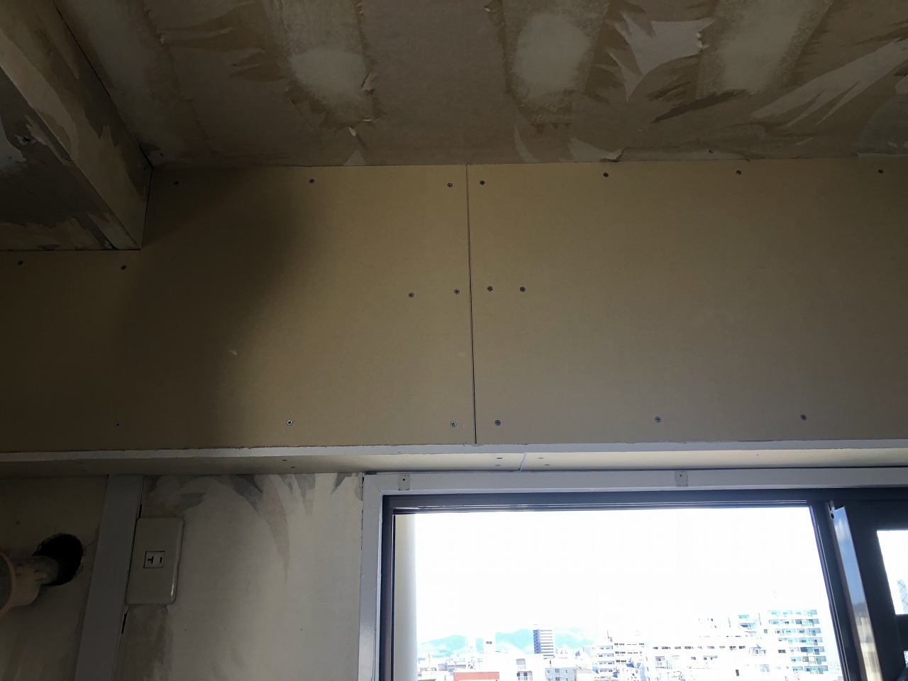 垂れ壁部分はコンクリートの躯体の表面がかなり傷んでいましたので通気を兼ねて下地に杉板で空間を作り、表面は石膏ボートを貼りクロスの下地を作りました。