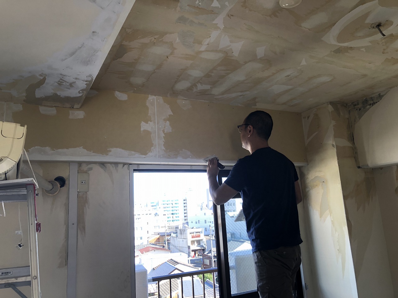 今までに何重ものクロスを貼っていたのか剥がしたときに段差ができましたので全面パテで段差を整えます。