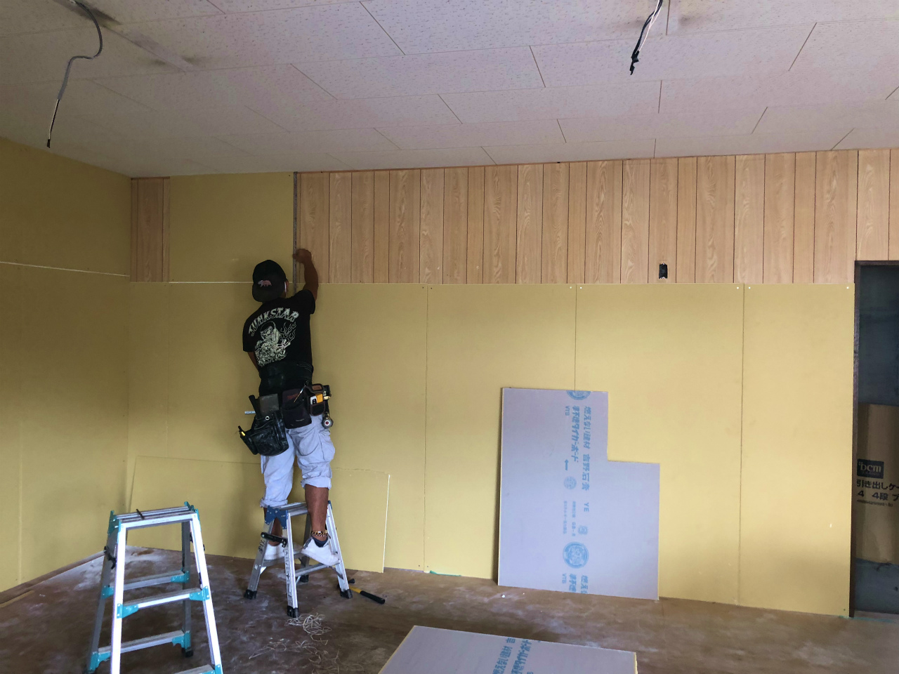 壁面にクロス加工の為石膏ボードを貼ります。