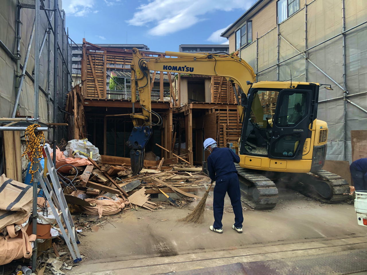 重機と手作業を併用して木材部分の解体を進めていきます。