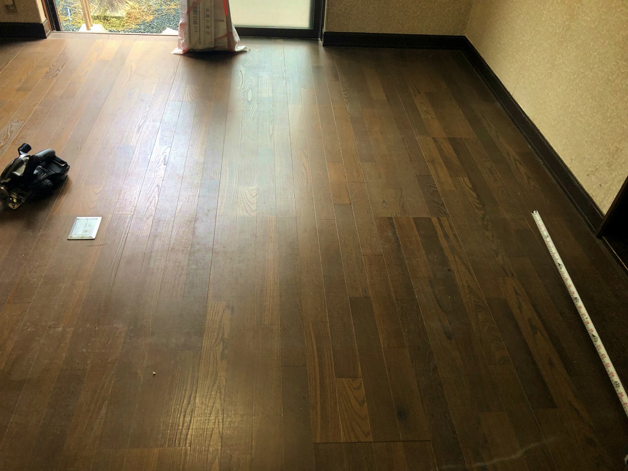 今回は直接のお施主様からのご依頼で一戸建てのリビングのフローリングの上張り工事を行いました。