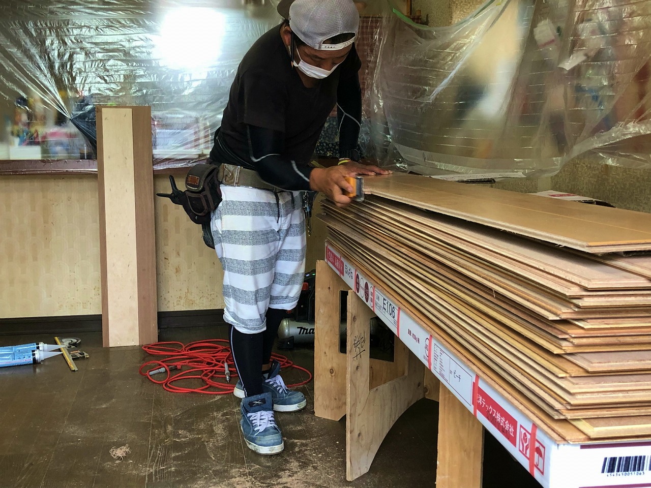 慎重に寸法を調整して基準となるフローリングを張ったところです。