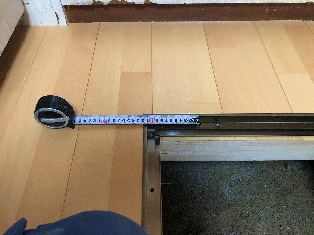 部屋の寸法を測り、ロスが少なく見栄えが良くできるように割付けを計算して基準になるフローリングを張ります