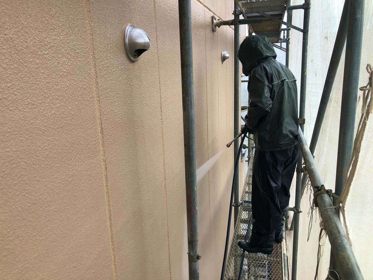 続いて足場と養生が完成しましたら塗装面(建物全体ベランダ含む)を高圧水を使用した水洗い処理をいたします。
