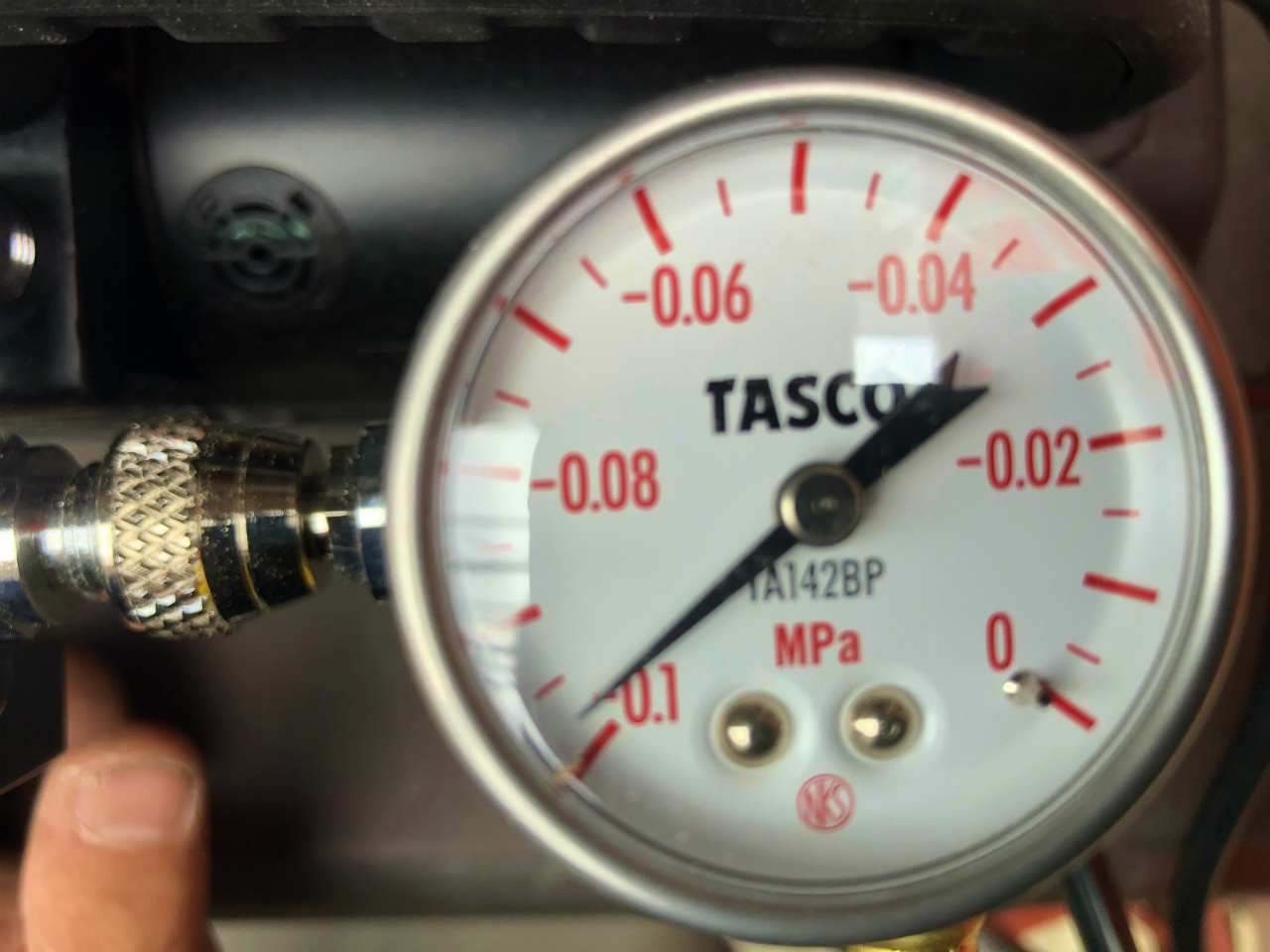 -0.1MPaまで真空引きを行い、漏れがないか10分程度メーターの針が動かないかチェックします。