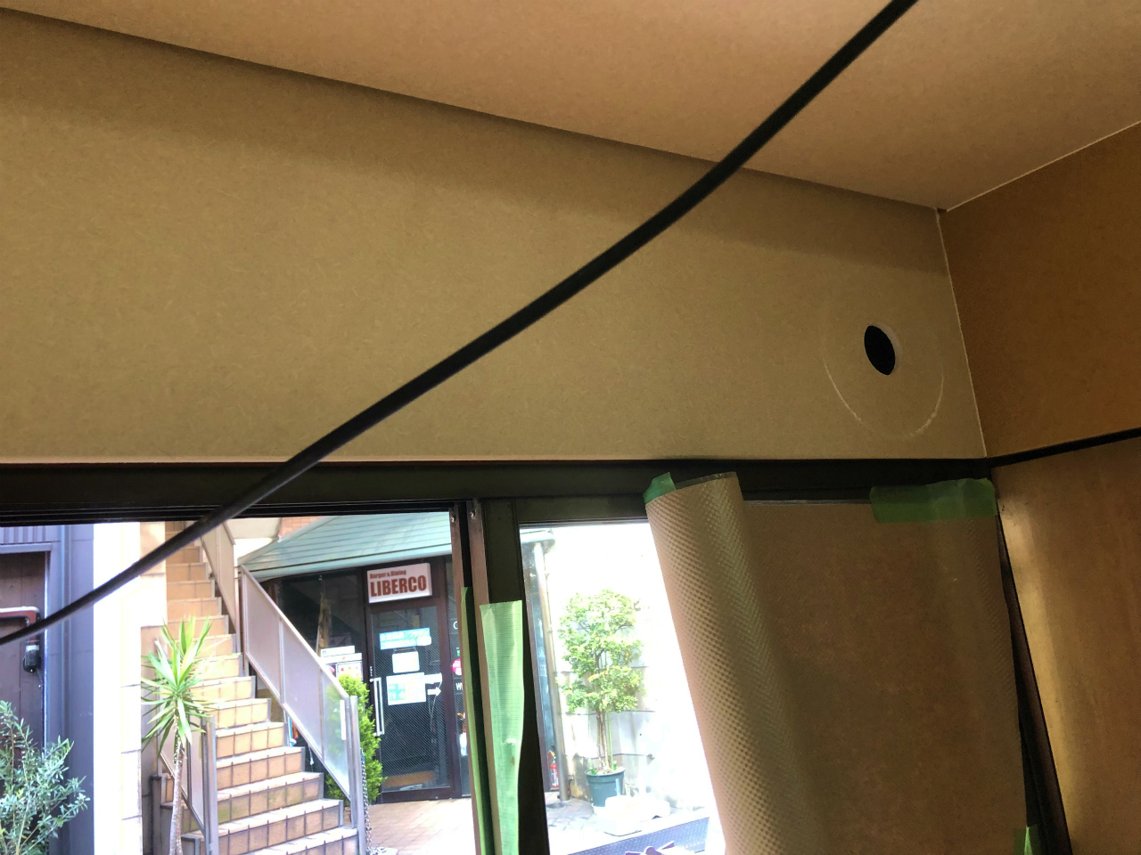 写真は冷媒ガスのペアコイルが通る穴を壁に開けたところです。
