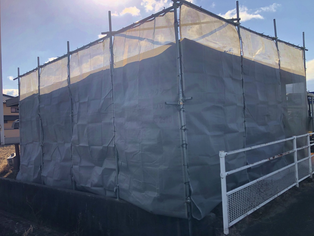 建屋内の残置物を撤去して足場養生の設置を行います。