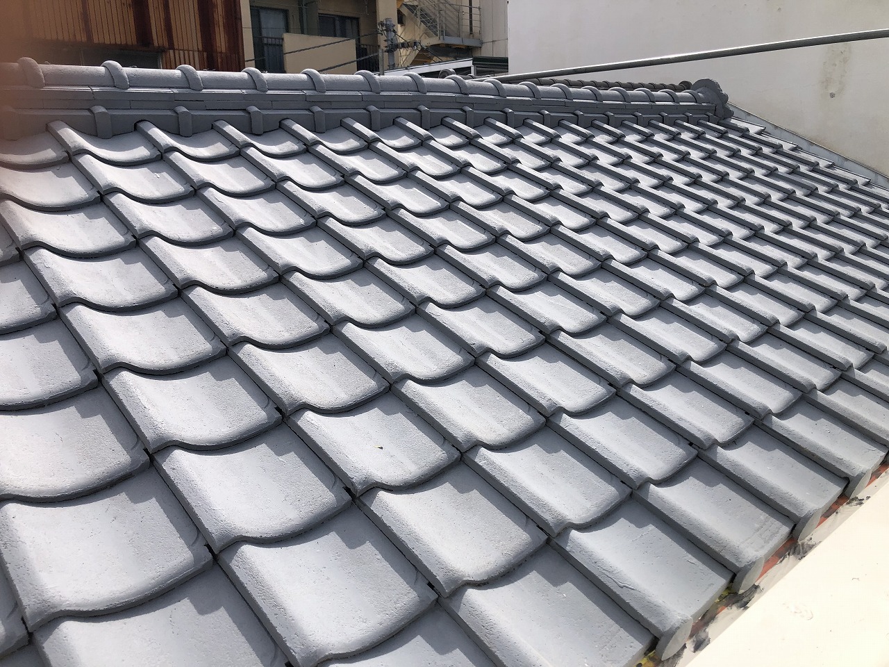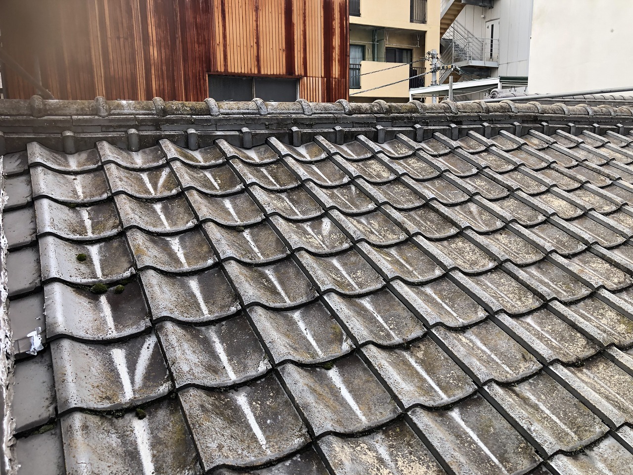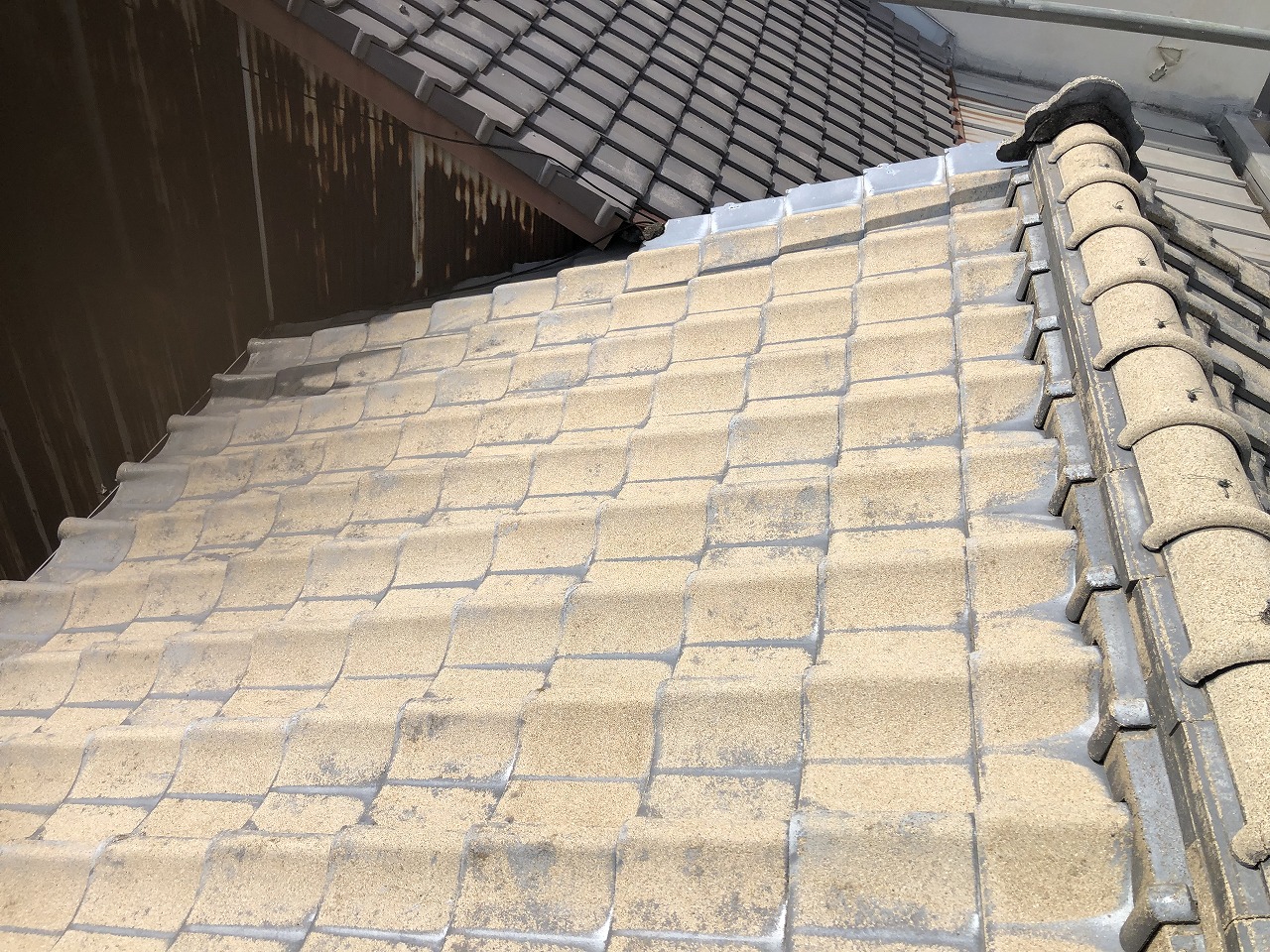 屋根の瓦はほとんどが表面の塗装がなくなっており地(セメント)が露出しております。