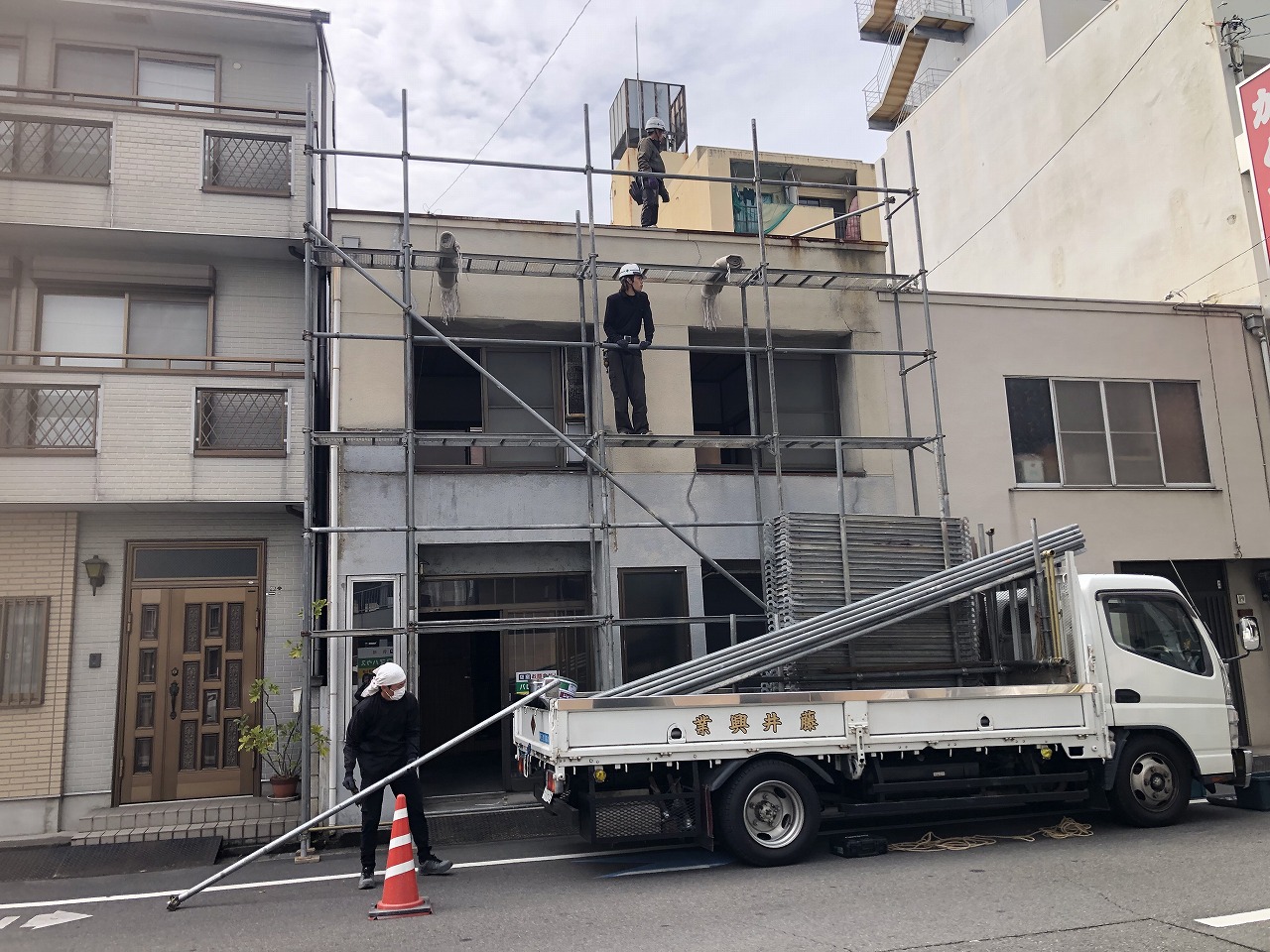 道路の占有・使用許可を取り、足場の設置と養生用のシートをつけていきます。