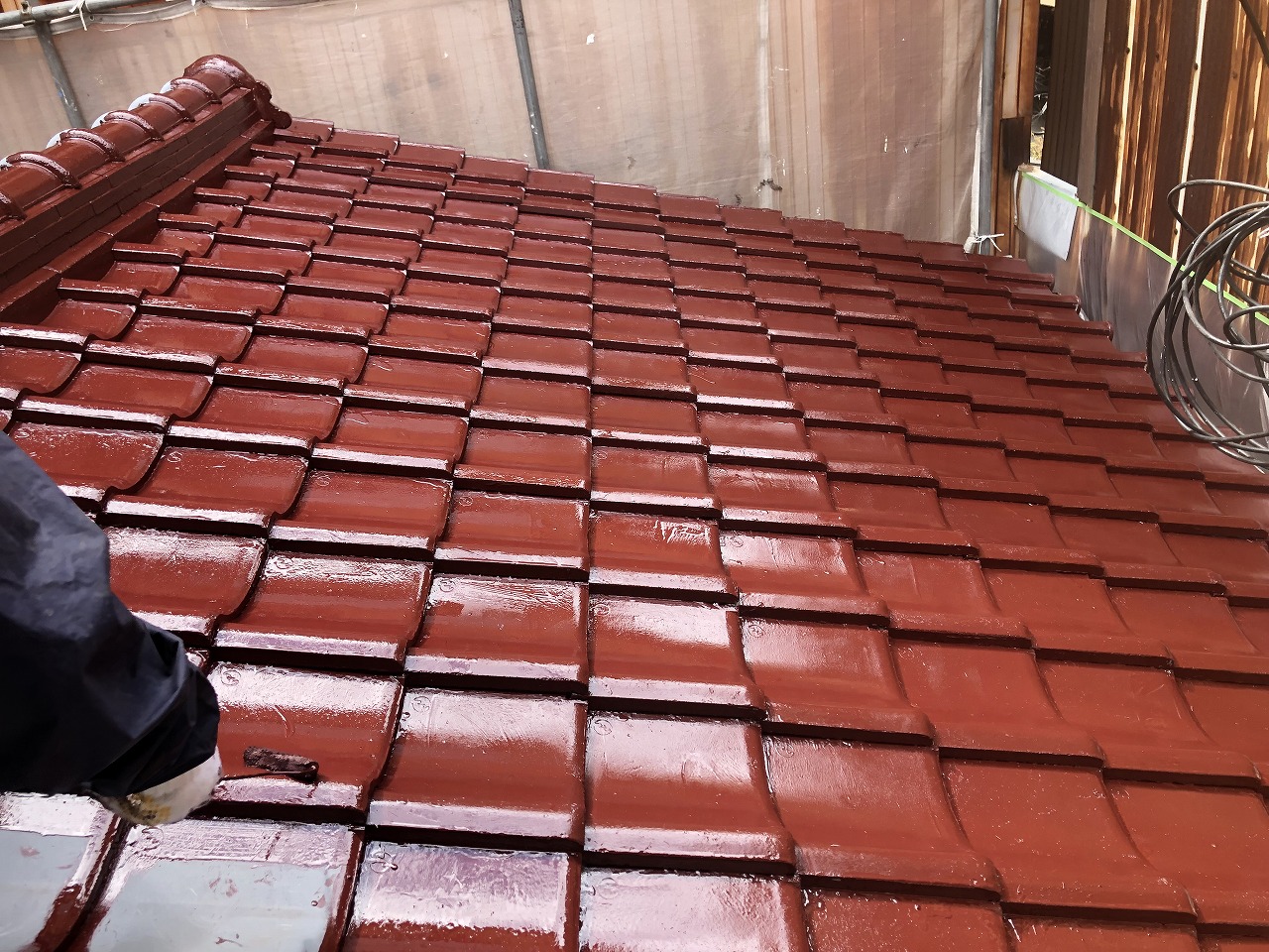 瓦の地を保護するために下地調整用のルーフガードを塗布して保護被膜をつくり上塗りに移ります。