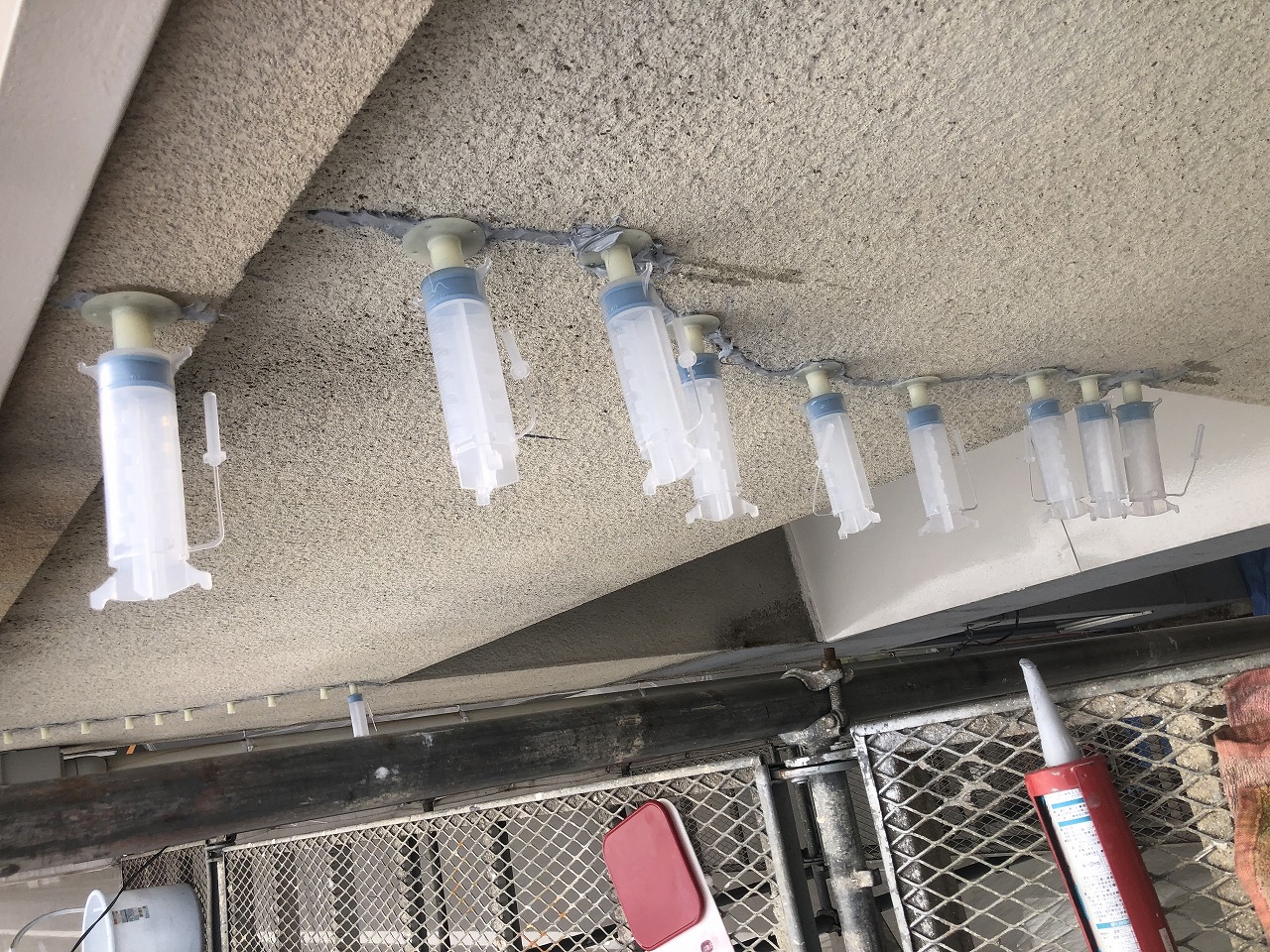 正面の外壁が大きくひび割れして浮き上がっていたので薬液注入して補修していきます。