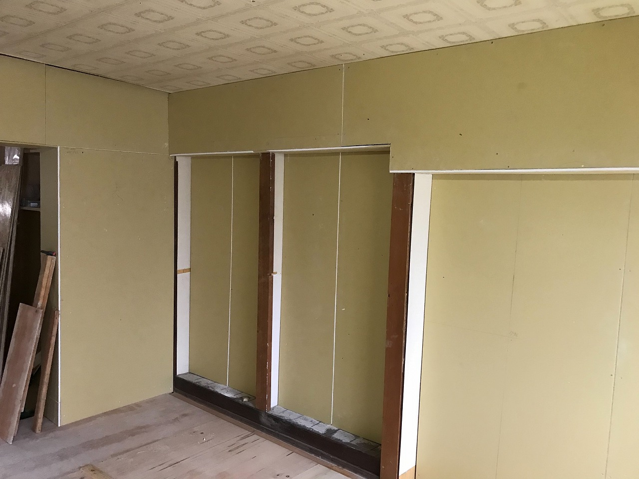 元々キッチンのあった壁を天袋を取り外したところ壁の施工が無かったのでタイル壁に沿って天井まで壁を造作していきます。