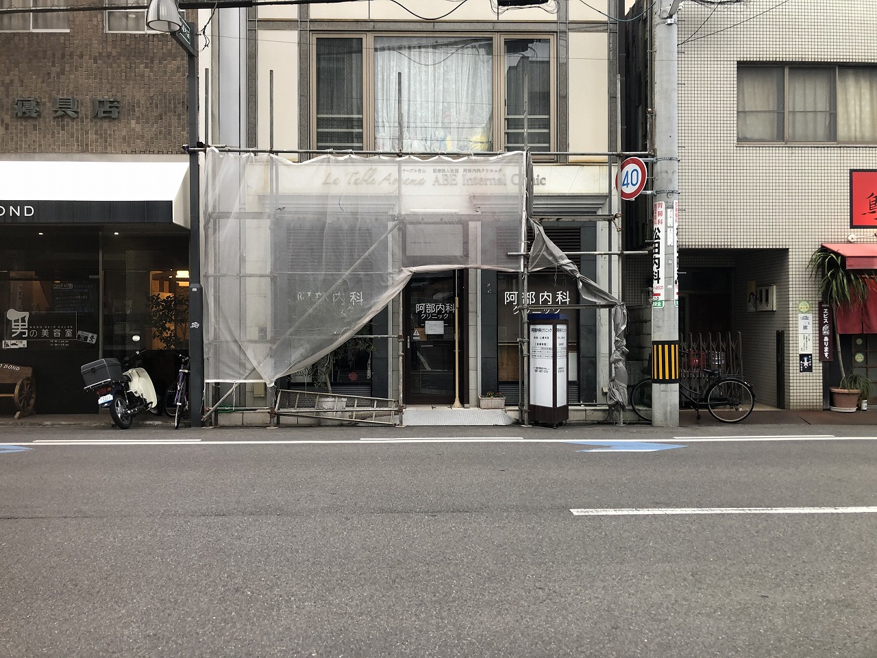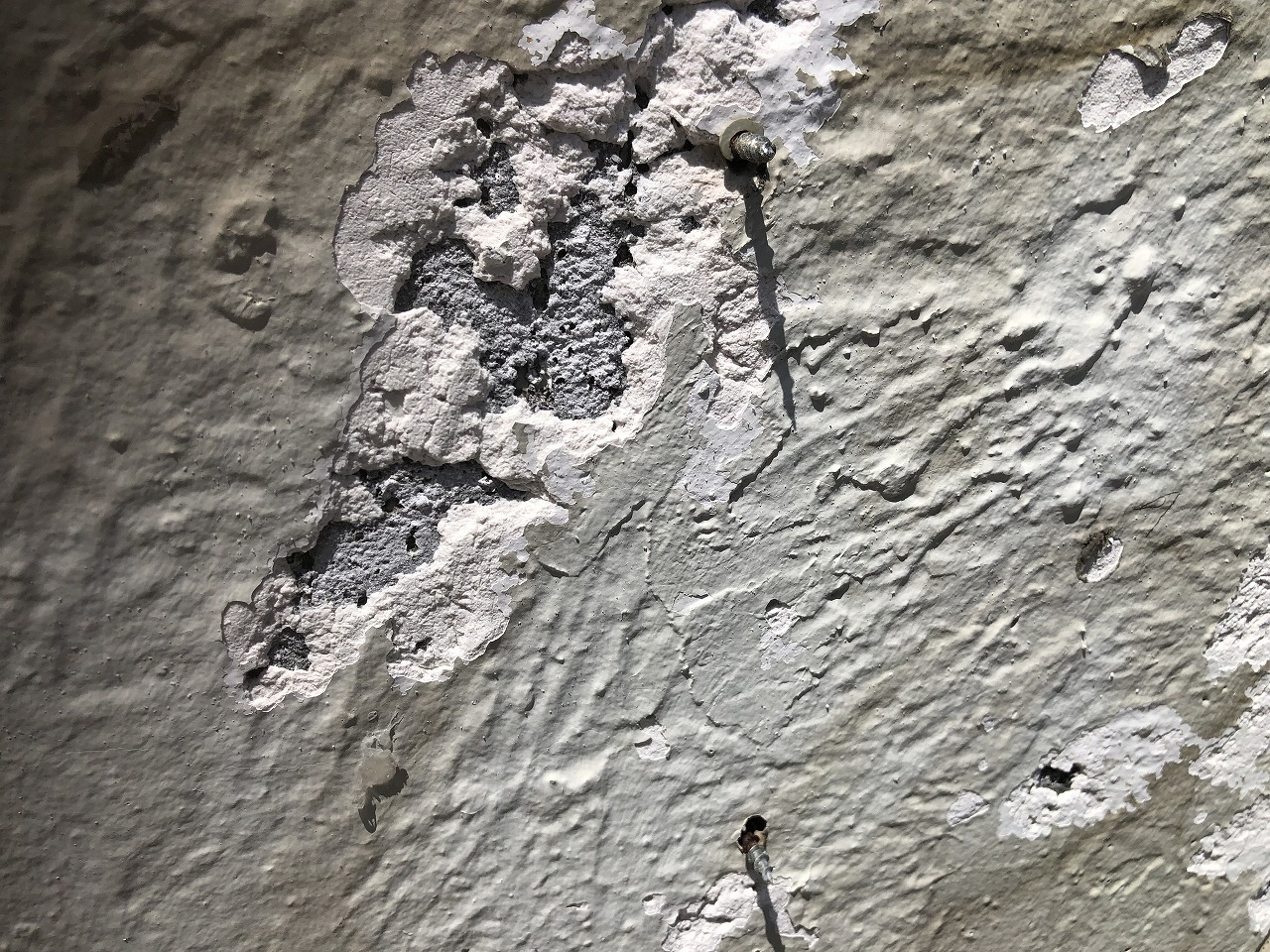 遠目からはまだ奇麗ですが、塗装工事に合わせて傷んだ壁面文字の撤去も併せて行います。