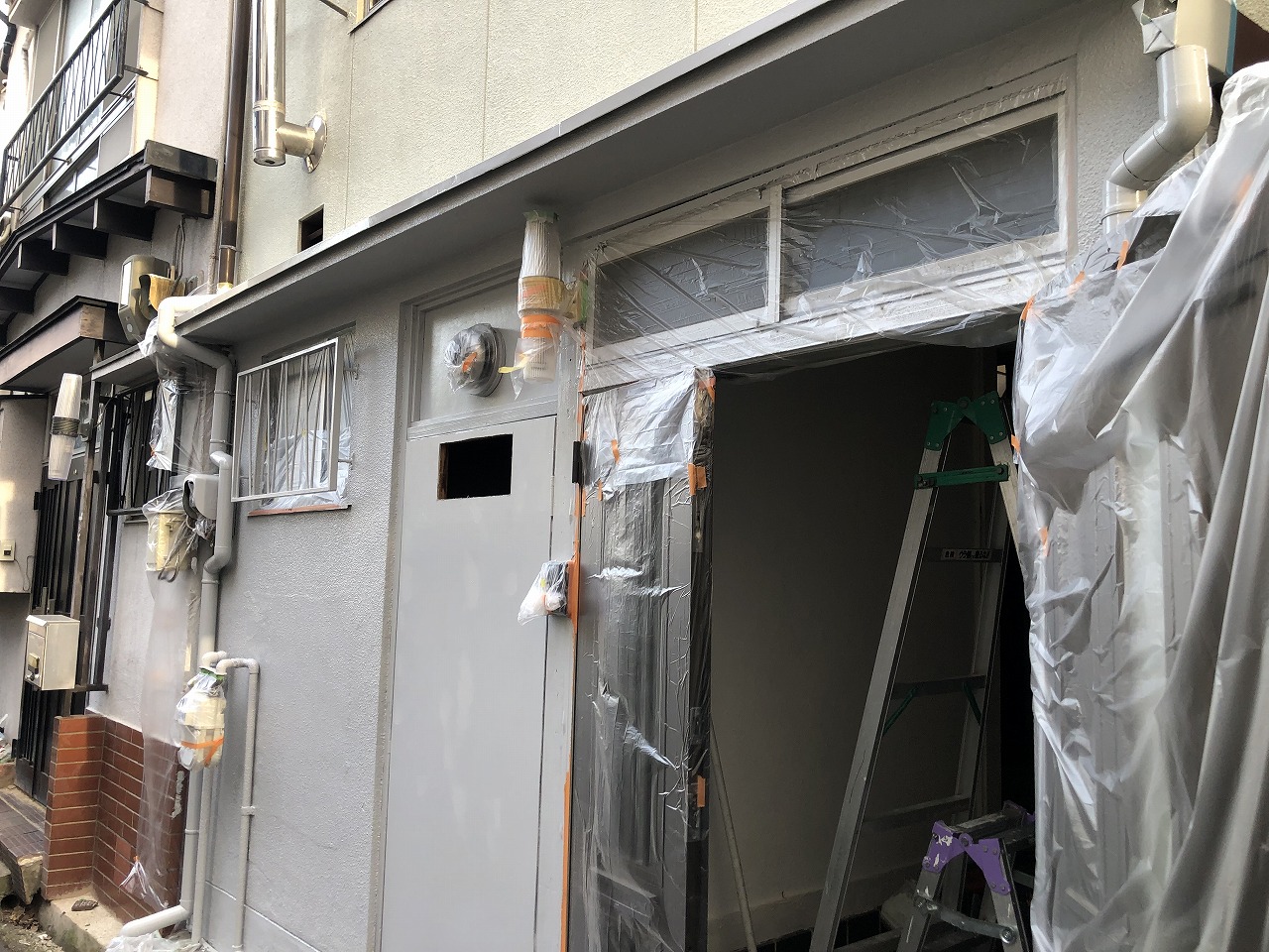 外壁の上塗り工程が終わりましたら、今回特別にアルミサッシ製の扉の塗装も行いました。