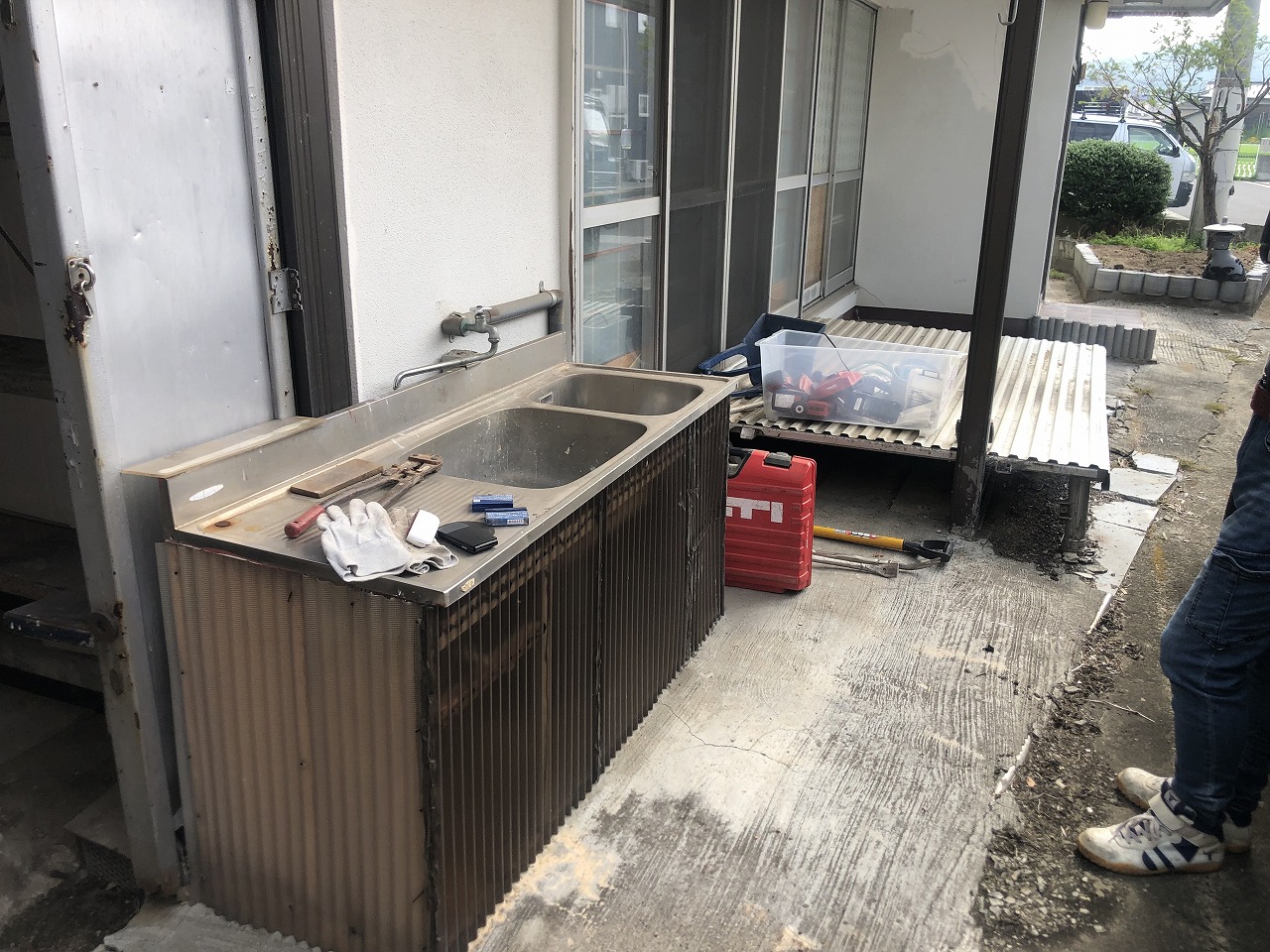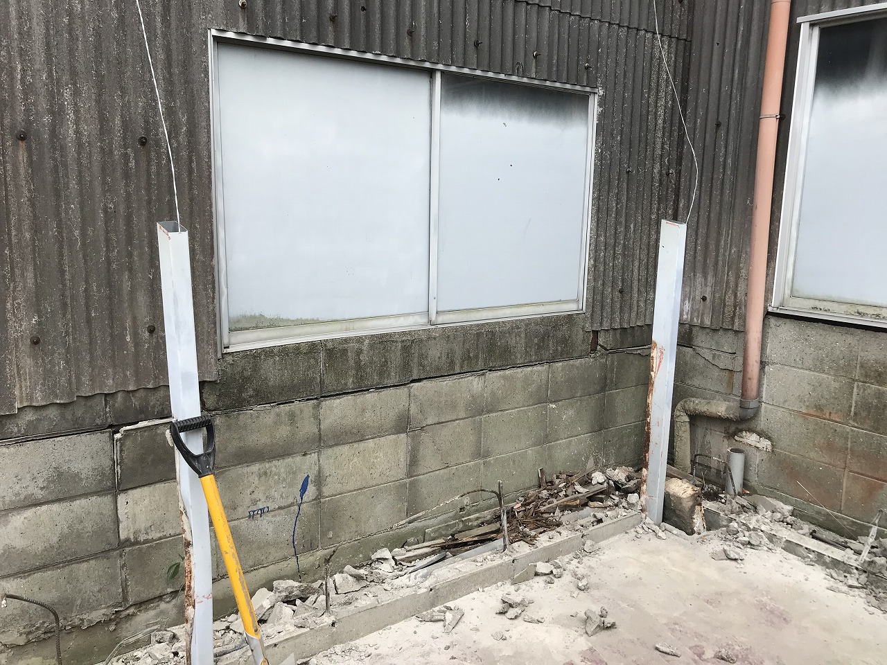 高松市 T様 解体工事 今回も前回の建設会社様よりプレハブ倉庫とブロック塀撤去、その他の工事を請負いました。 解体工事前 BEFOUR 現地調査 敷地の手前はブロック塀とカーポート、流し台と縁台がありました。 こちらが流し台と縁台です。これらを全て撤去していきます。 敷地の奥に物置倉庫です。 搬出経路的に奥で分解・切断して手搬出です。 同じく奥側にフード自販機がありました。 こちらも奥で分解・切断して手搬出です。 解体工事開始 解体開始 ブロック塀とカーポートは機械と手作業併用で解体します。 ブロック塀は土間のコンクリートに埋まっている為土間のGLに合わせて斫って高さを合わせます。 一部排水管の隣接部は排水管破損防止のためGLより少し残しました。 解体工事完了 AFTER 全ての解体と撤去が完了し、周囲の清掃を行い、完工です。 2022年7月18日工事実績ブロック塀解体,不用品処分,倉庫解体,危険ブロック塀撤去,解体工事