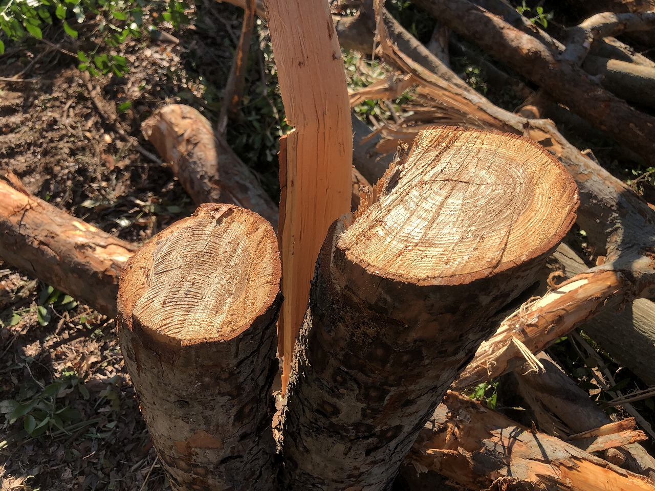 生えている木を切り倒した後、枝葉と幹にチェーンソーでカットして分けて行きます。