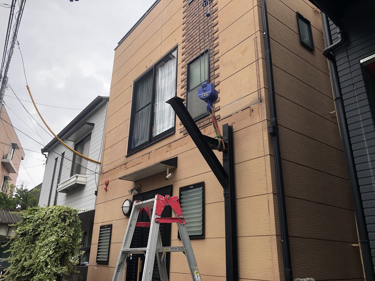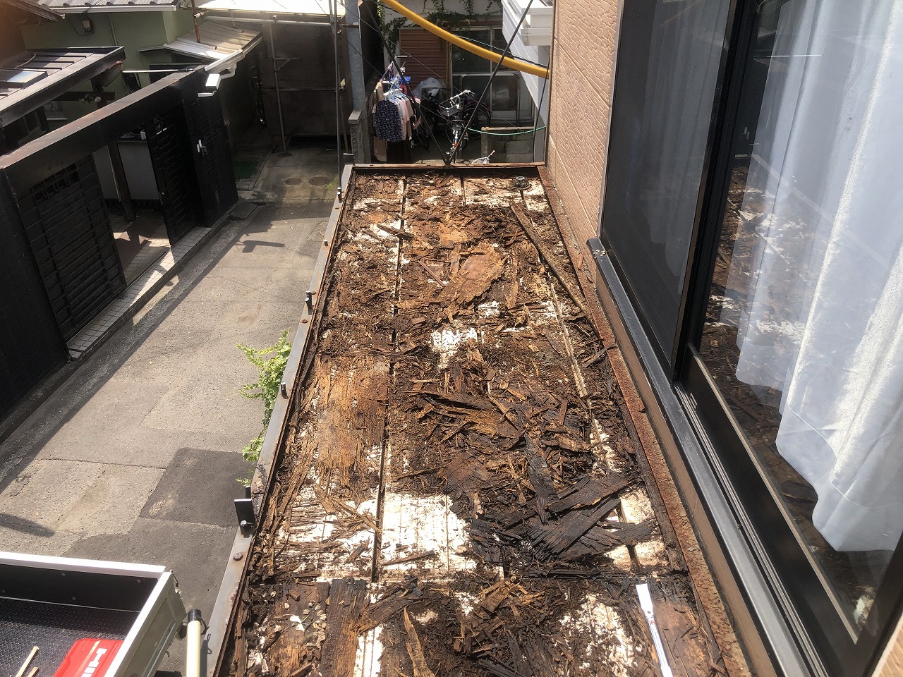 高松市 I様 バルコニー撤去 今回は協力会社の方よりのご依頼でバルコニーの解体撤去工事を請負いました。 2階部分のベランダ構造をクレーンで吊り下げながら解体していくようになります。 周囲にスペースがなくまた上部には電線が多数ありますので慎重に進めていきます。 バルコニー撤去開始 写真の作業は手摺りを切断撤去の後、FRP防水層を撤去して床材を撤去していくところです。 プラスチック製の床板をはがした後床板の支持材と軒天部分を解体していきます。 ベランダの床部分がないので地上から脚立作業で進めていきます。 鉄製のバルコニーのフレームをクレーンで吊り下げながら落下と荷揺れに注意して切断していきます。 電線が多数ありますのでクレーンの操作を慎重に行いながら吊り下ろしていきます。 バルコニー撤去完了 全ての解体と撤去が完了し周囲の清掃を行い完工です。 2022年8月22日工事実績バルコニー撤去,解体工事