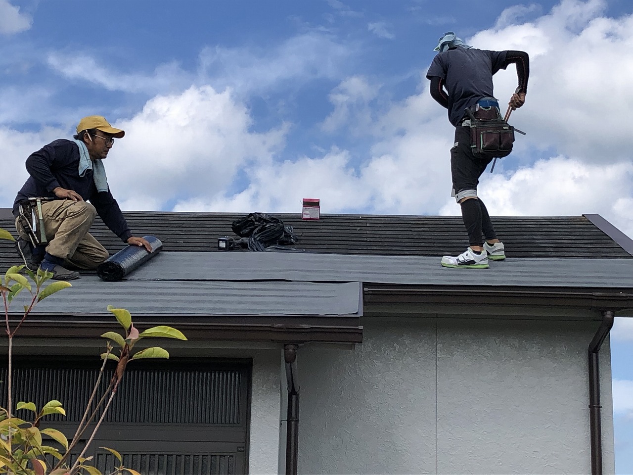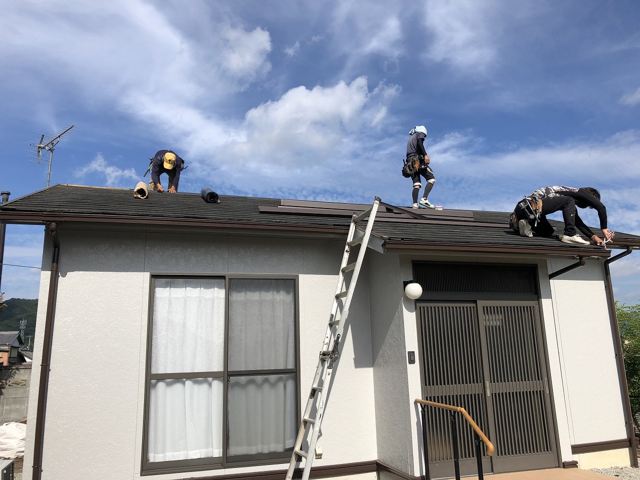 屋根周囲の唐草ができたのちに屋根全体を粘着性の防水シートを張っていきます。