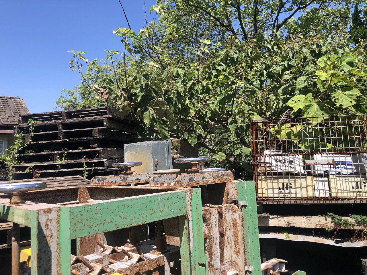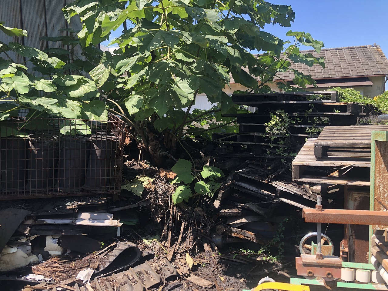写真のように桐が生い茂っており、木の周りに大量の木製パレットが積まれていました。