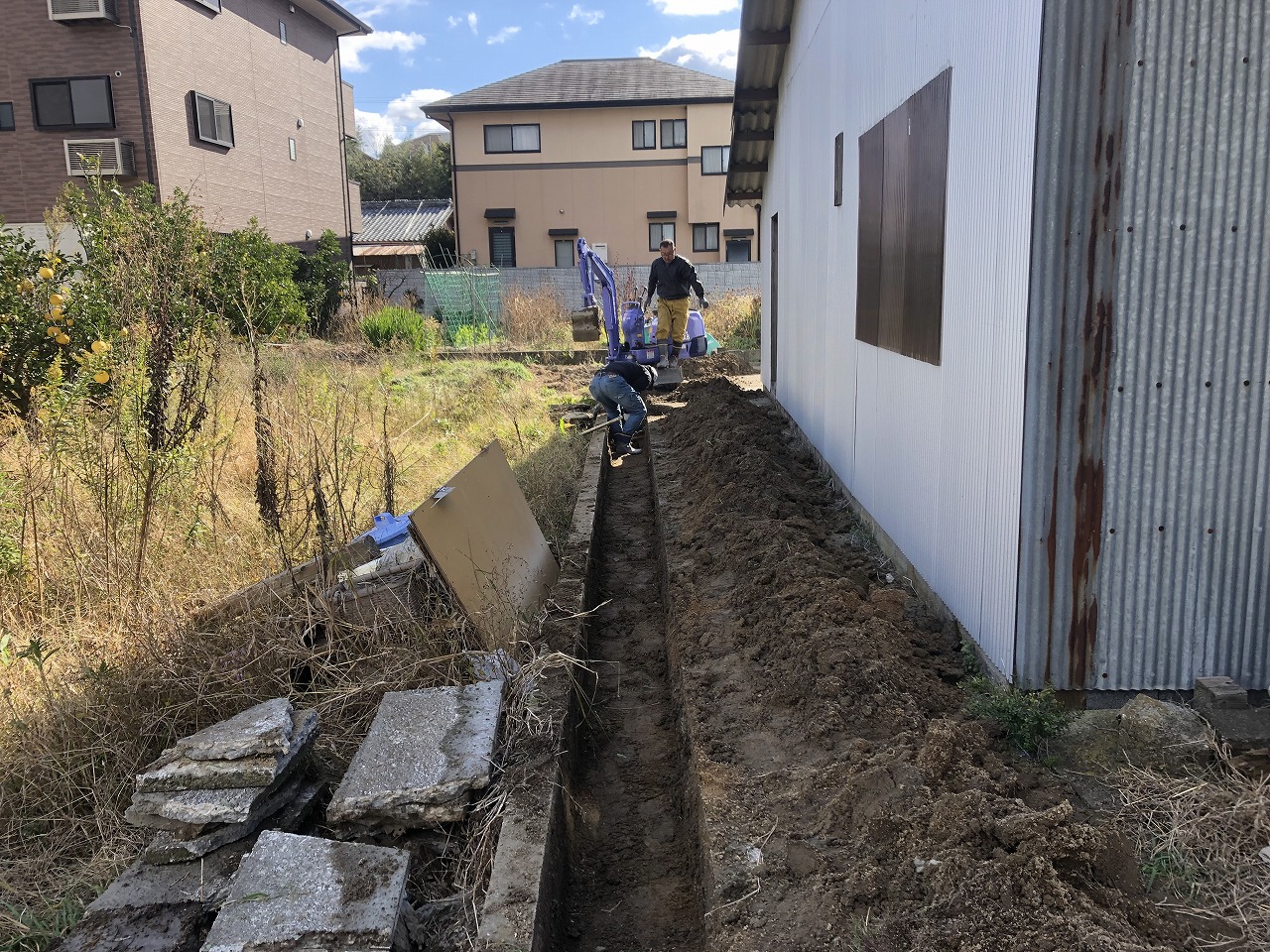 母屋部分のほうも同じく掘削を行っていきます。重機のスペースがないので人力で掘っていきます。