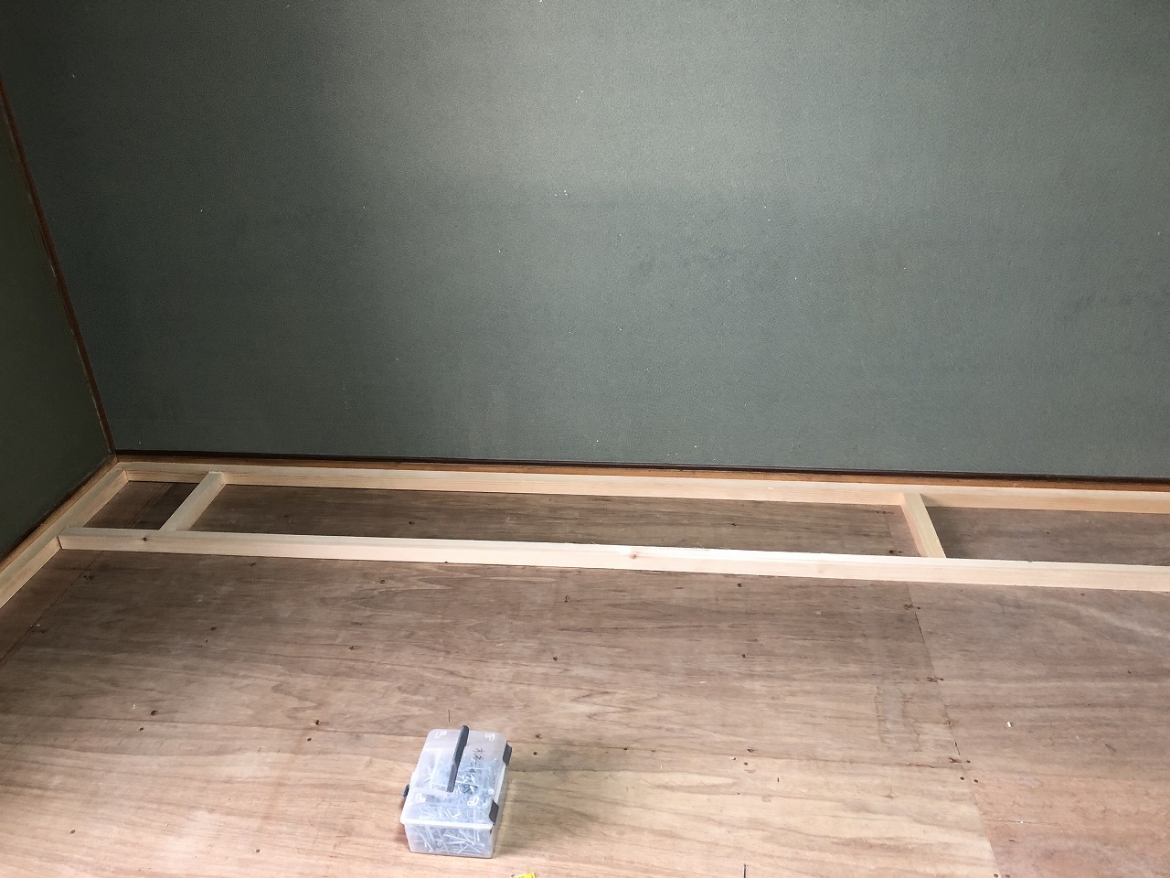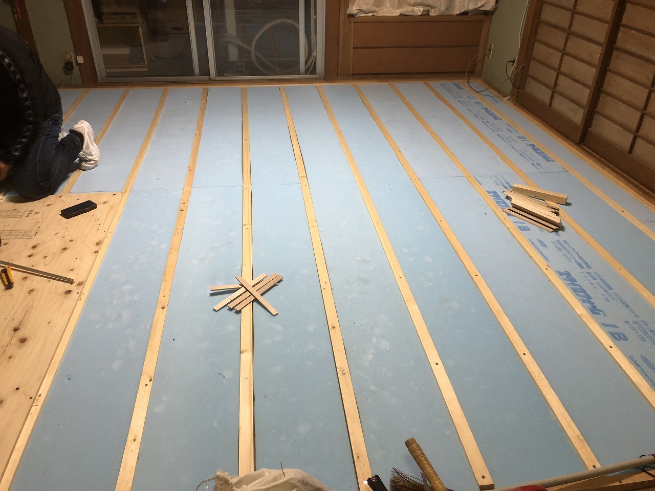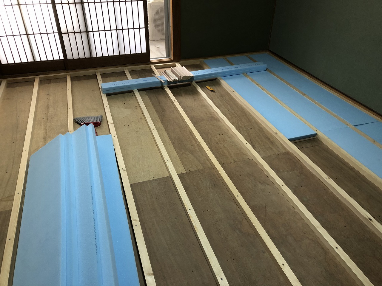 畳の撤去してと下地の嵩上げ調整を行います。今回は仕上がり(畳の厚み)が60mmなので製材した下地材と捨て貼りコンパネで調整します。