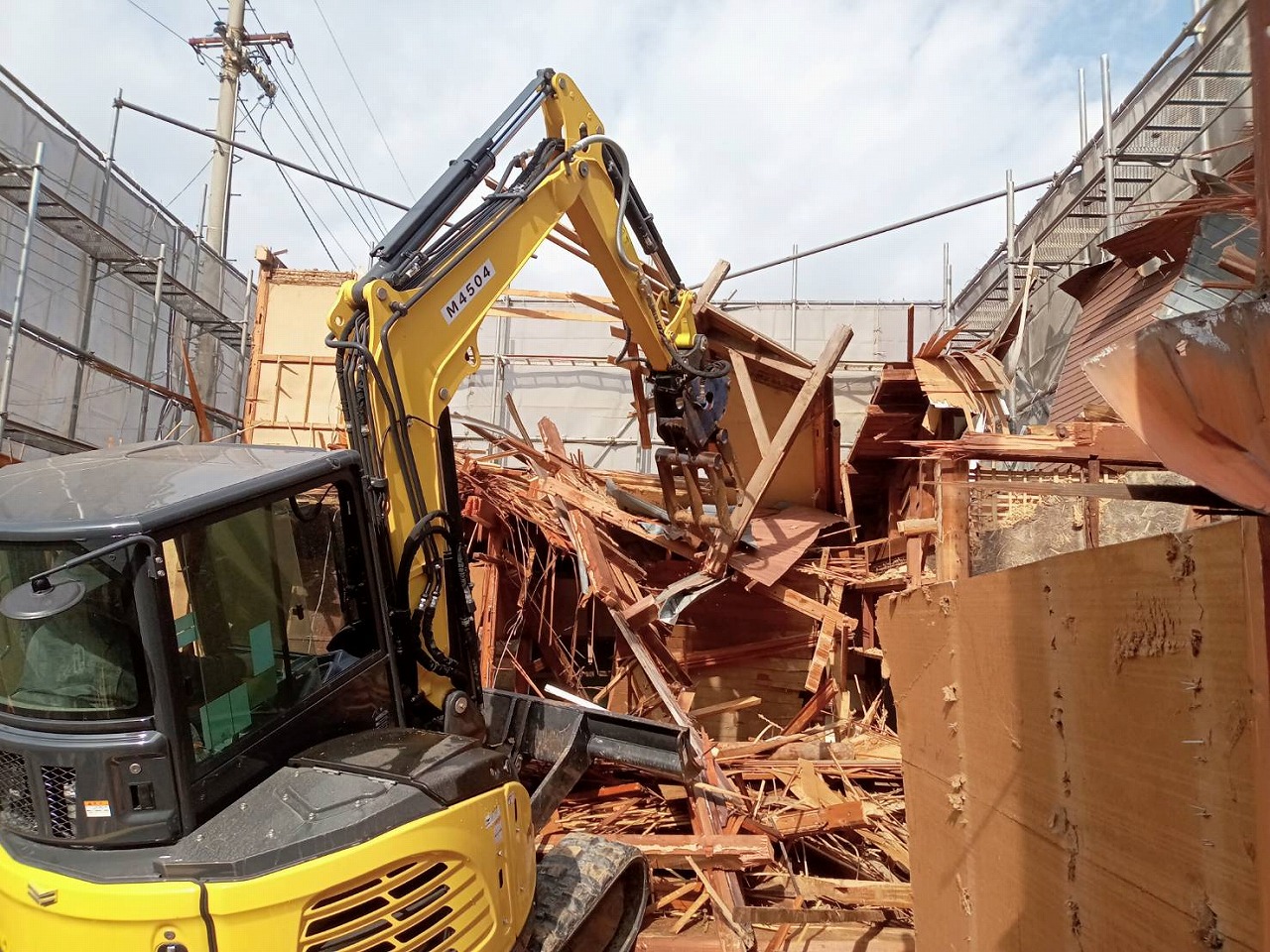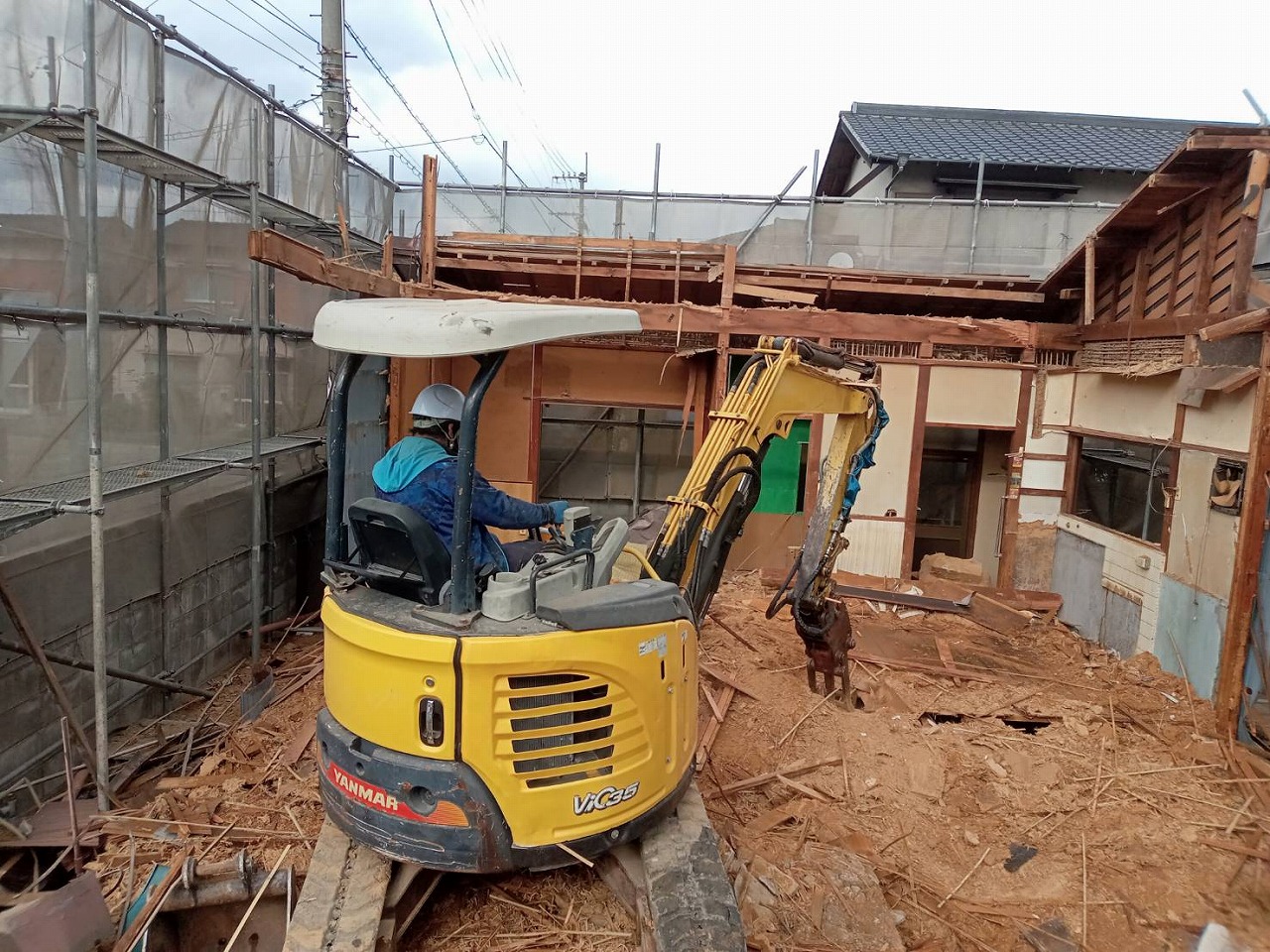 2階部分の解体が終わりましたら、足場を1階部分の高さに合わせて下げたのち1階部分を解体します。