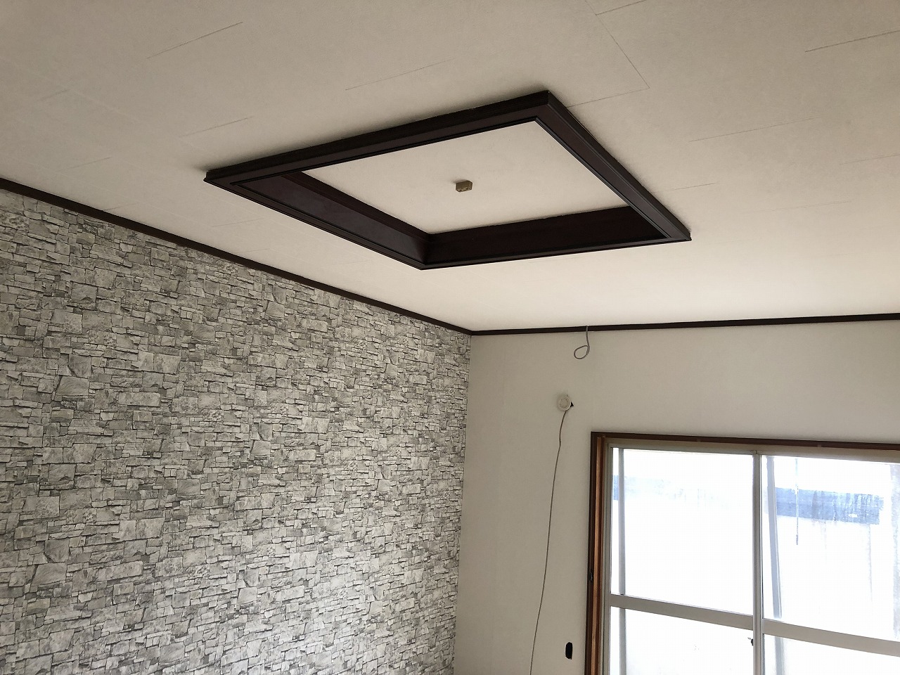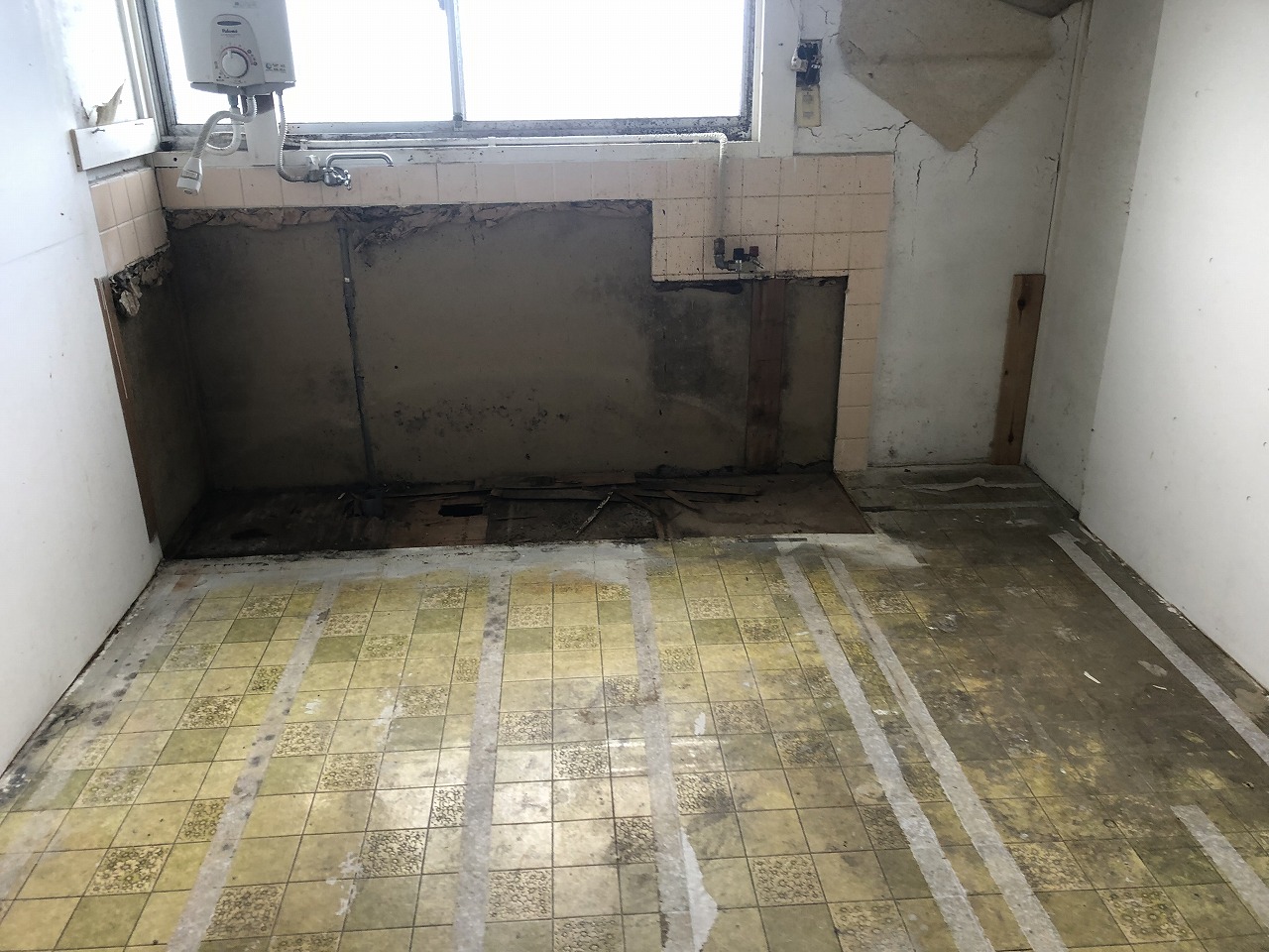 内装リフォームの内容はクロス工事やクッションフロアー張りなどはお施主様が担当して、弊社は大工工事と塗装工事、外部の波板の貼替えと駐車場の整地が主な内容になります。