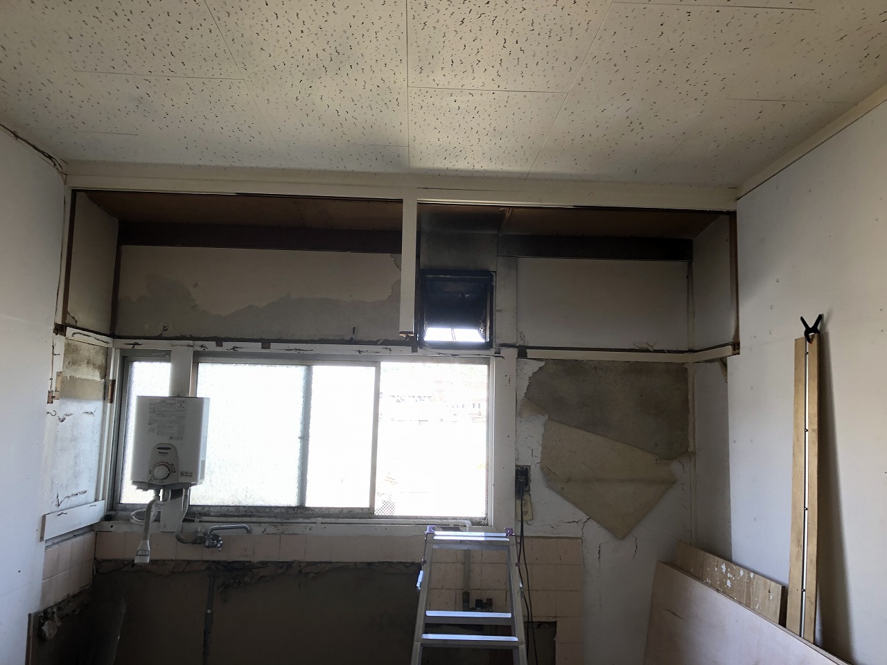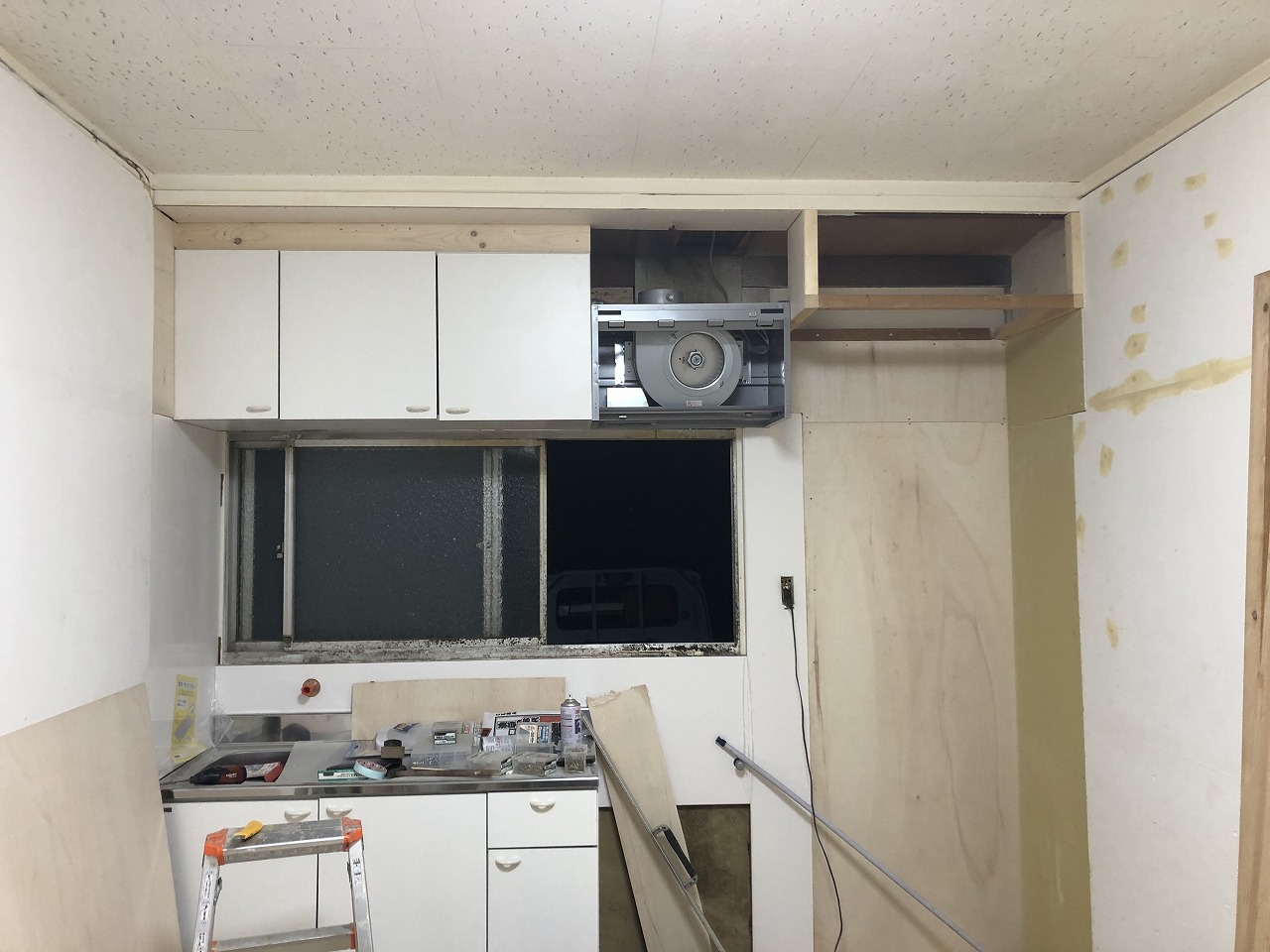 キッチンの戸棚部分を解体します。新しく吊戸棚と換気扇が取り付けれるようにスペースを確保するために解体します。