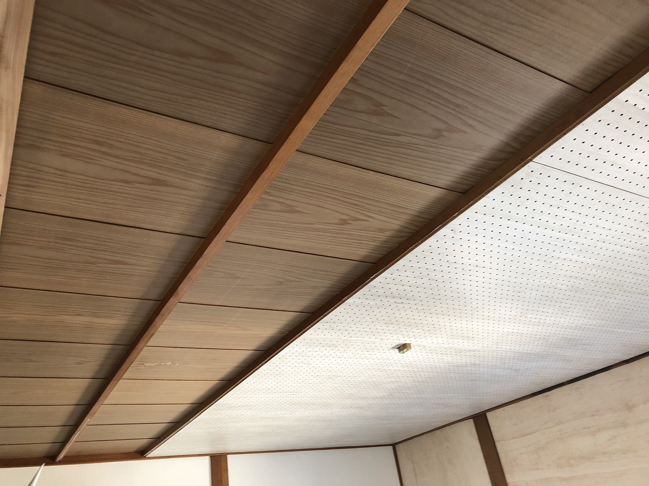 2階の和室の天井に雨漏れの跡などがあり傷んでいましたので既存の天井桟にあわせて有孔ボードを貼っていきます。