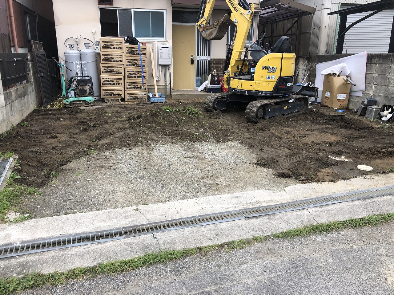 外構工事としてお施主様が駐車場に強化プラスチック製の駐車マットを敷設するため全体を整地してしっかり転圧していきます。