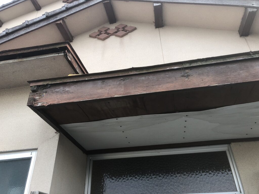 破風板が腐食しており、また玄関の軒天のベニヤ板も分離してはがれていました。