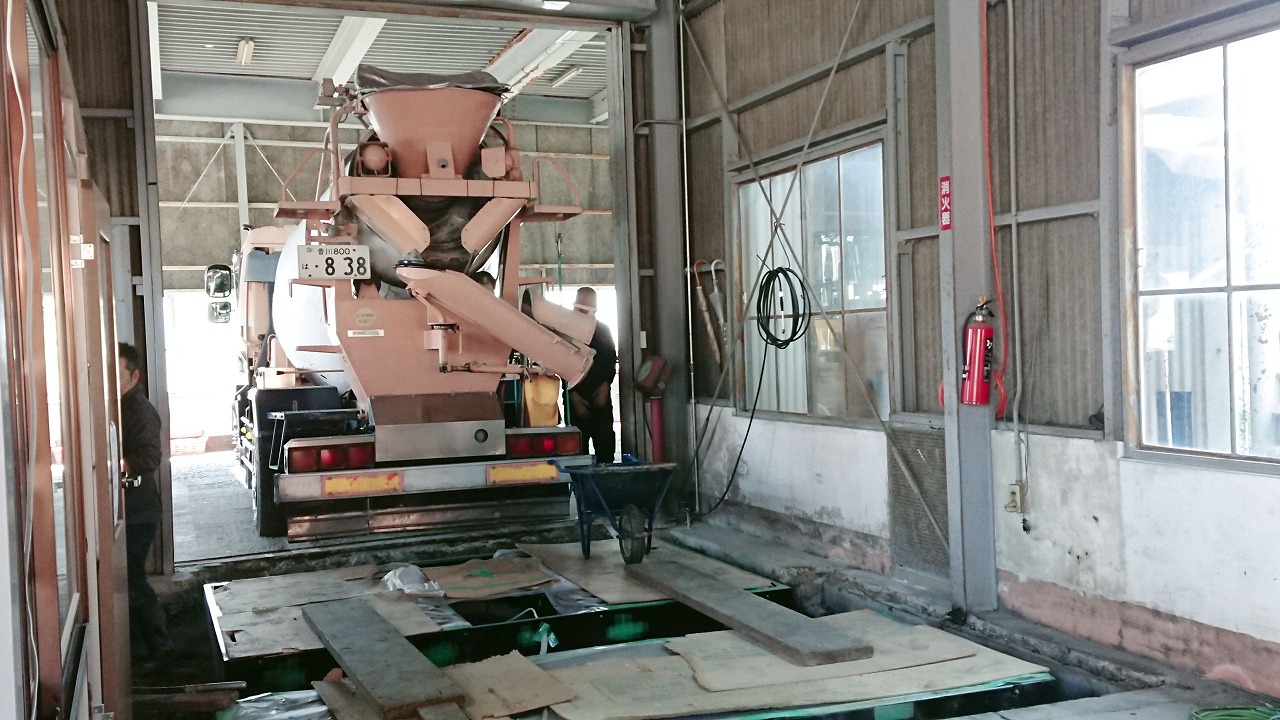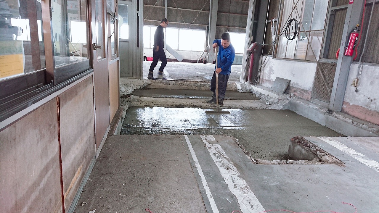 大型車ラインの工事と内容はほぼ同じく既存機器撤去・新しい機器のレイアウトに合わせて基礎部分のハツリ・ピットの埋戻し・ベースコンクリート打設・機器の据付・コンクリートの打設で埋め戻しとモルタルと仕上げになります。