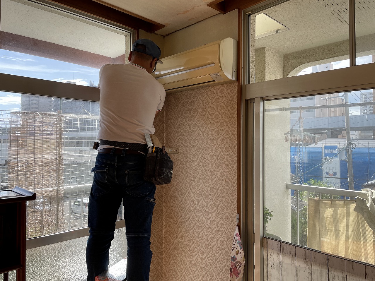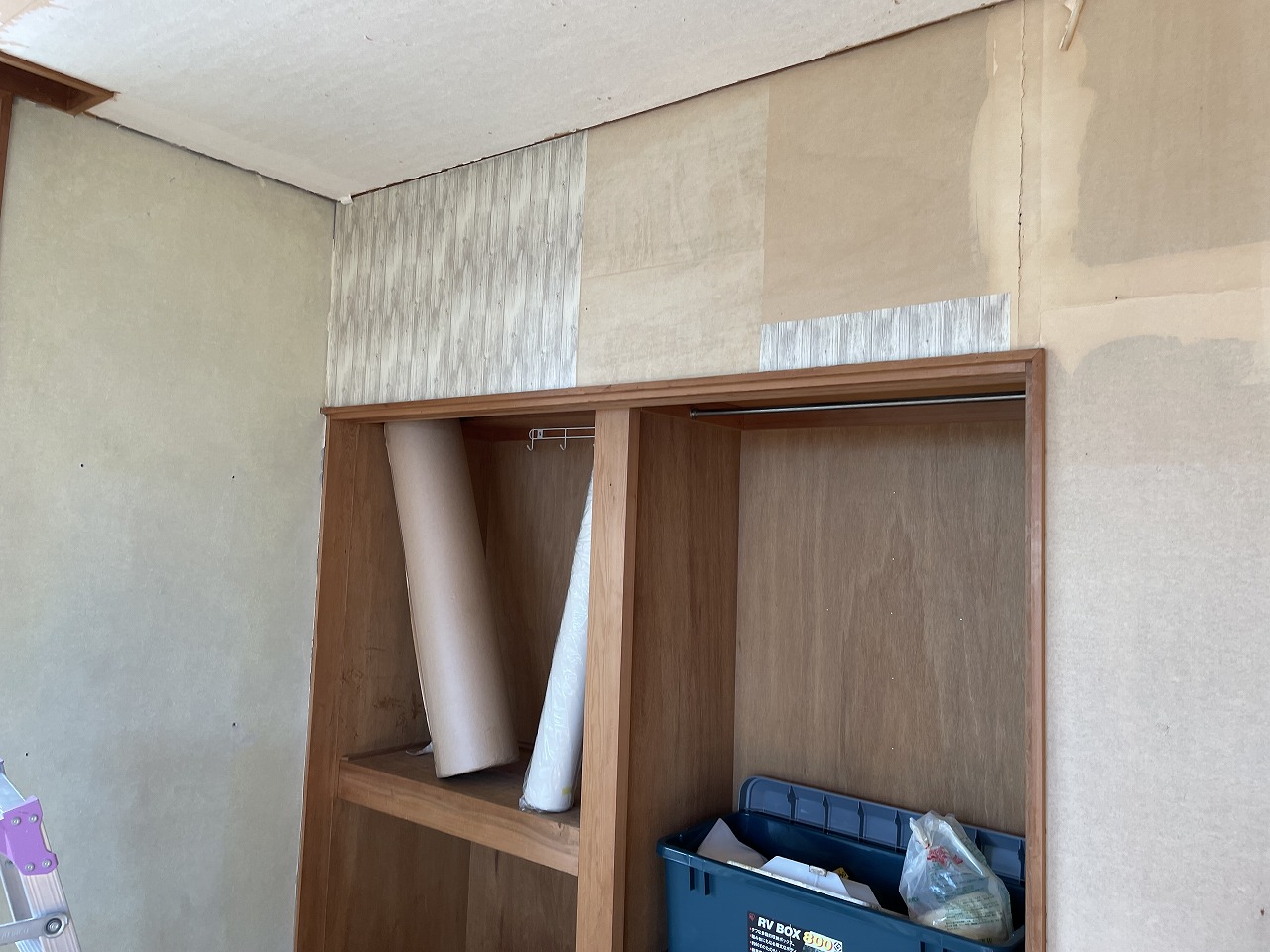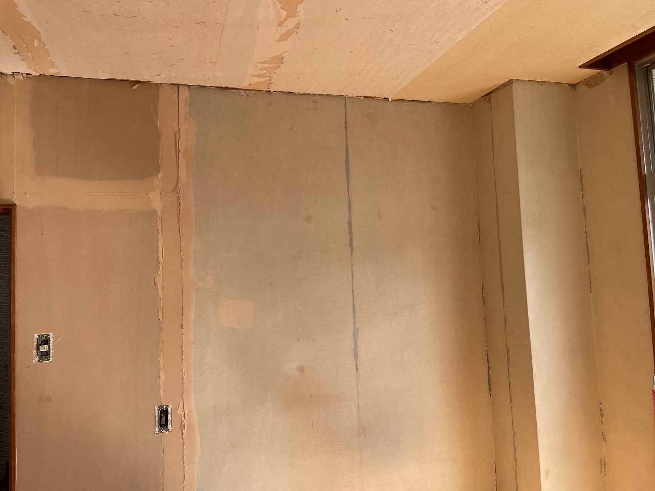 既存のクロスを慎重に剥がしていきます。裏紙と言われる部分が雑に塀でしまうと新しく張ったときに段差ができたり既存の裏紙が浮いてしまって定着が悪くなることがありますので丁寧にはぎ取っていきます。