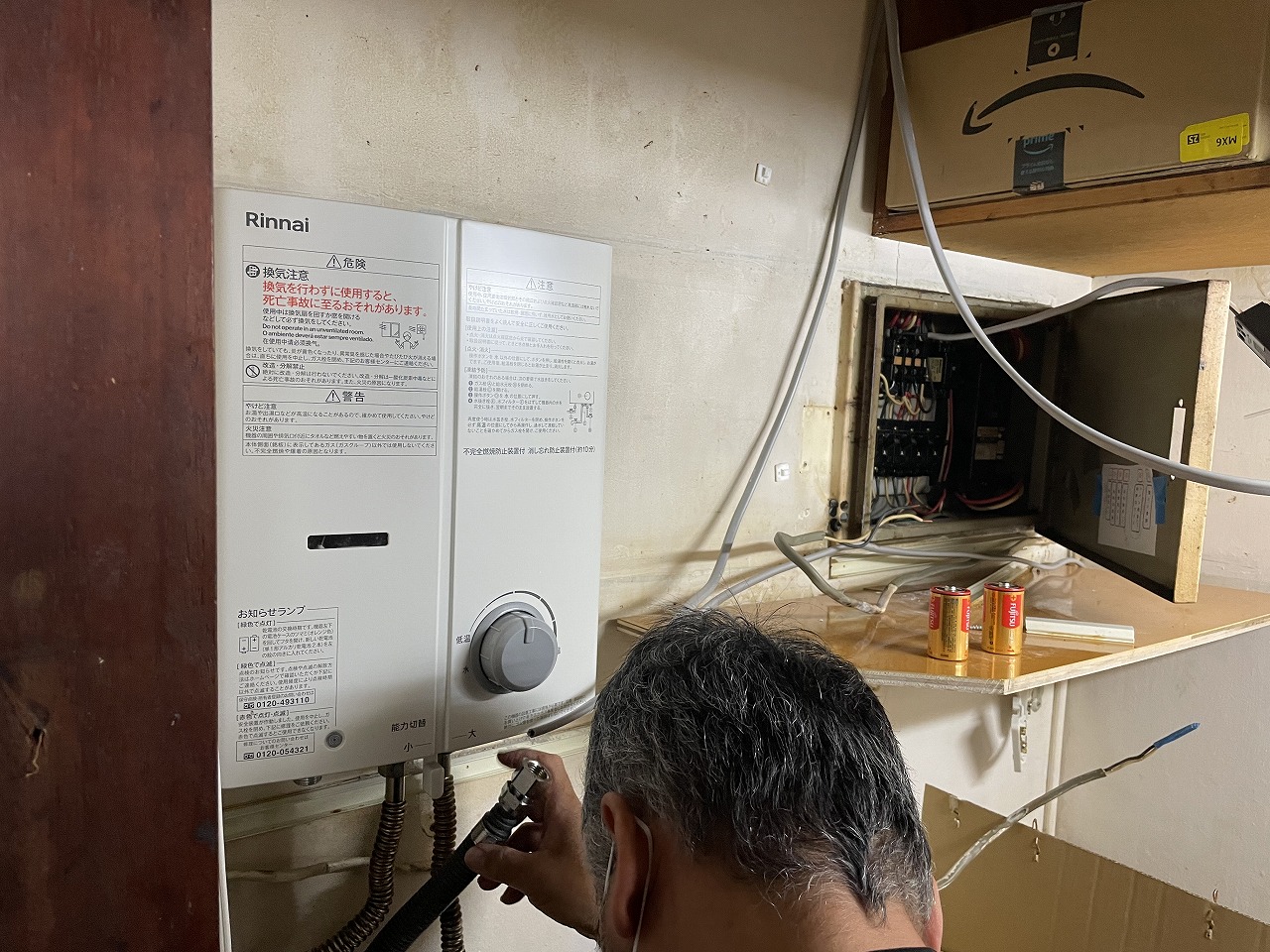 調理室にあたる部屋についていたガス給湯機もお施主様手配で新品に交換しました。