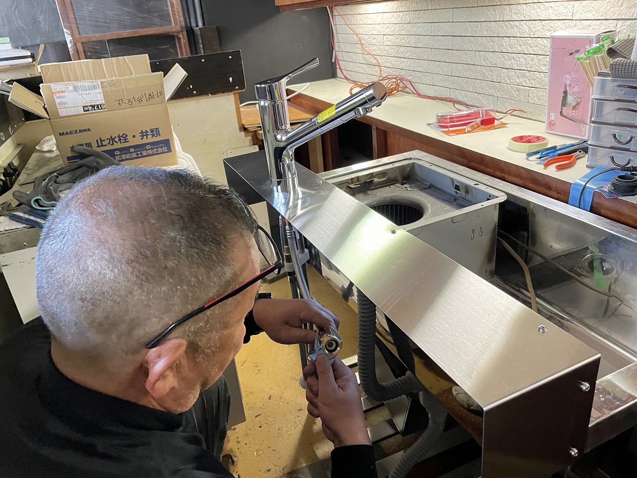 流し台などはお施主様が手配したものにカスタムして取付していきます。