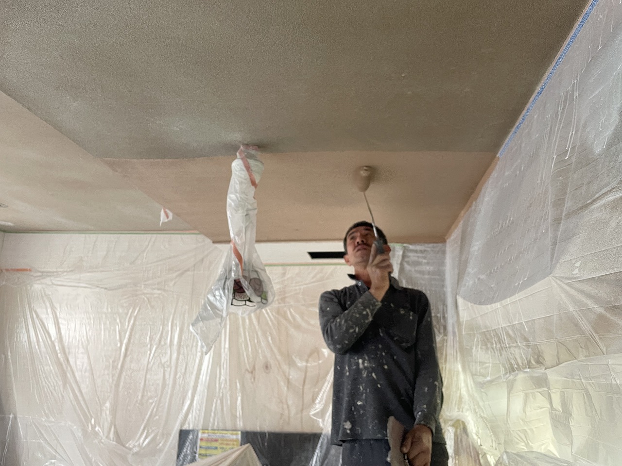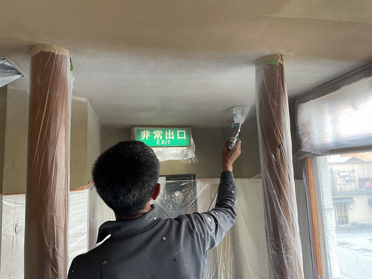 今回は壁が和室などによくある砂地の仕上げだったため砂の表面を保護する下地材を吹き付けました。