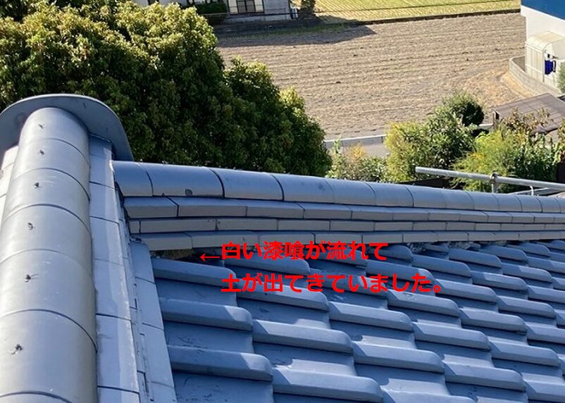 棟部分の工事前ですがぱっと見はわかりませんが隅棟の部分の漆喰が流れて土が出てきています。