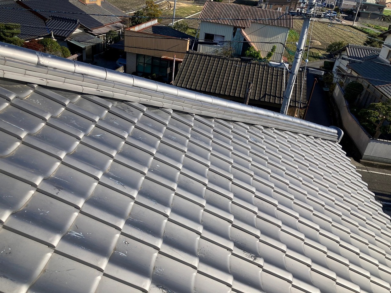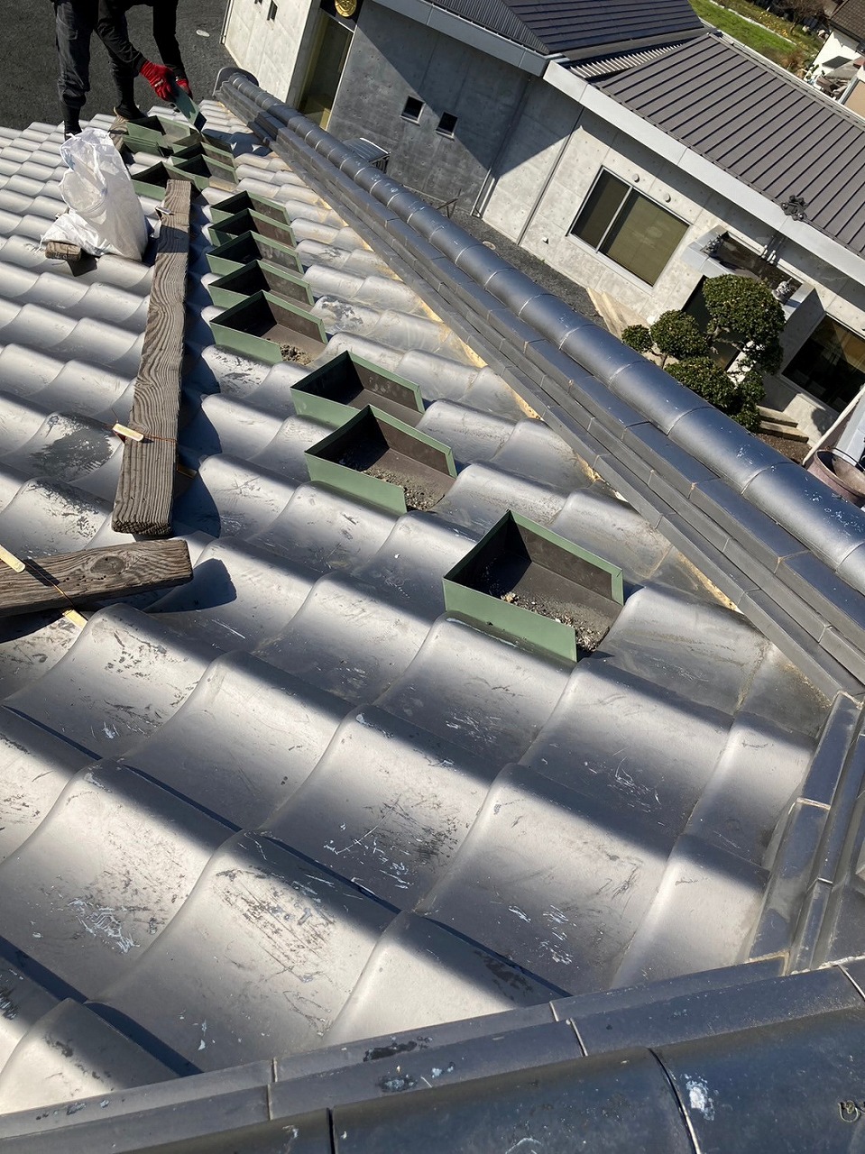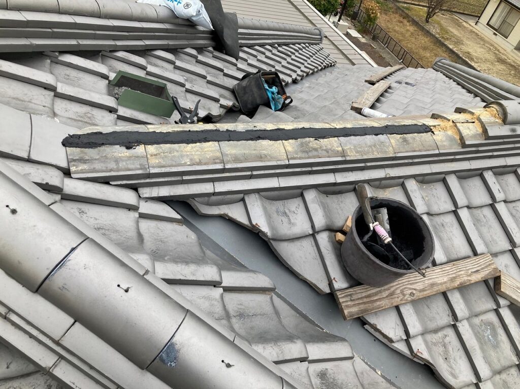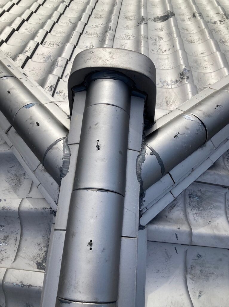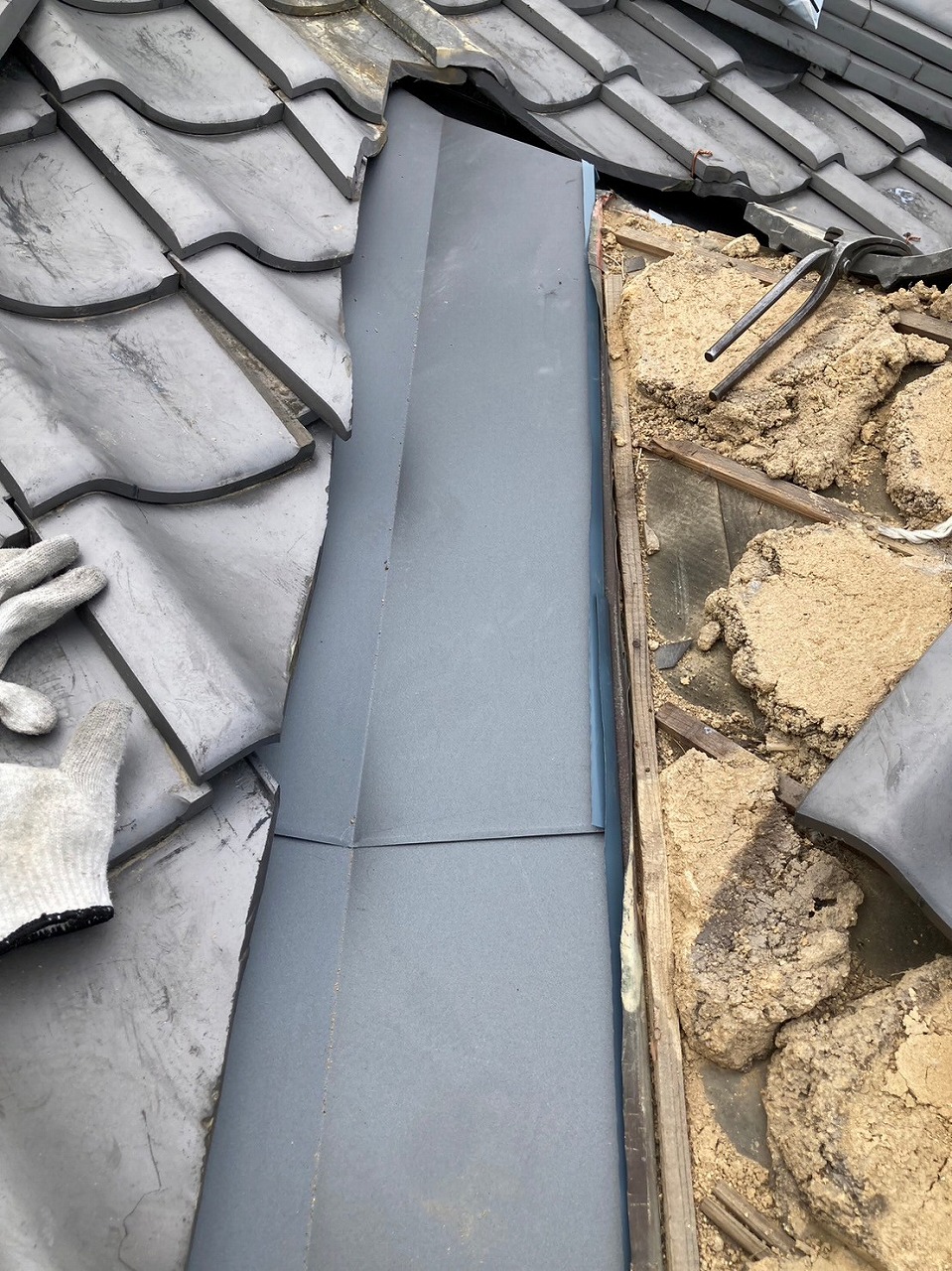 外壁の塗装工事と樋工事・水切り板金工事が終わり、瓦業者様の日程を調整して急遽決定した2階部分の屋根瓦の谷部分の板金が銅板製だったためステンレスの金属板に取り換えるのと棟部分の隅棟の漆喰が流れ出ていたため再度補填することになりました。
