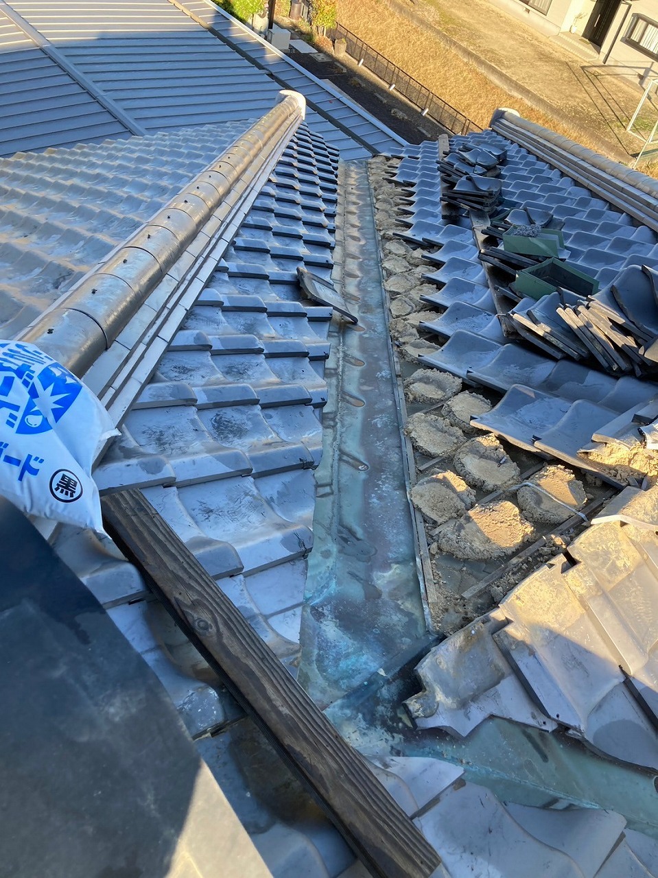瓦工事前の写真です。一見問題なさそうに見えますが谷部分の板金が銅板製ですので月日がたてば先に取り換えた樋のように腐食して浸水するとわかりましたので今回工事する決断になりました。
