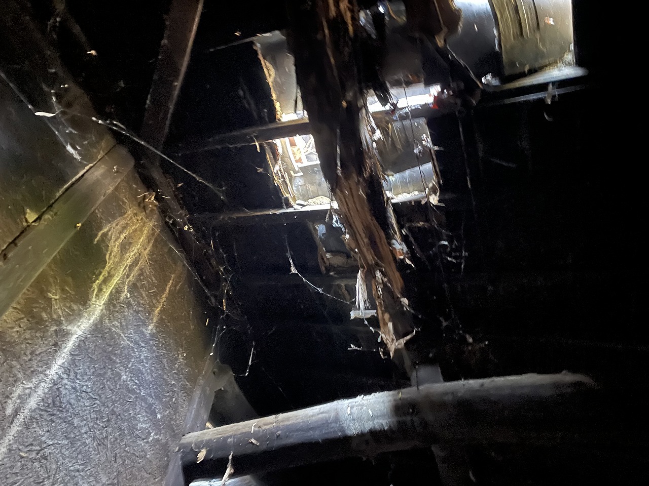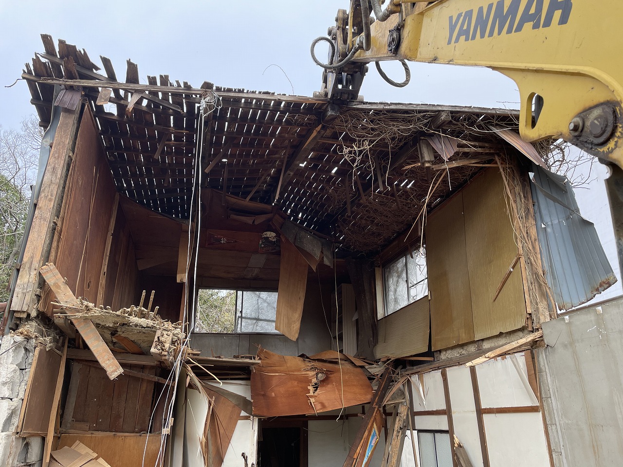 写真では2階の床がすでに一部なくなっていますが、この部分が重機での解体時に少し引いたときに一気に崩落しました。