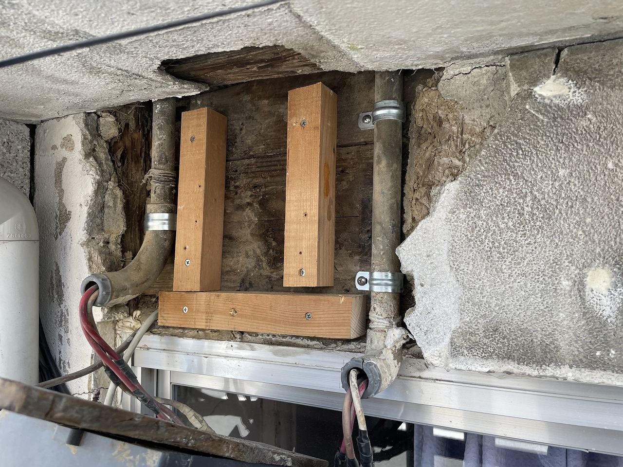 サッシ工事と合わせて電力メーターの取付部分の補修を行いました。