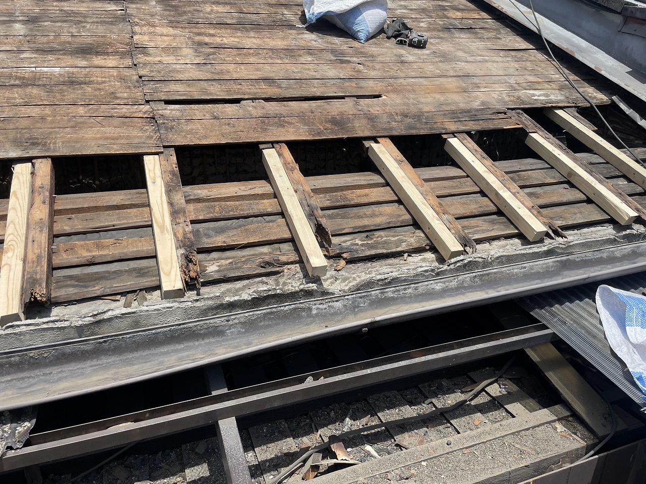 今回の屋根工事では下地の野地板と場所によって垂木までもが腐食しているところがありましたので捨て貼り材の貼り付けと合わせて補修していきます。
