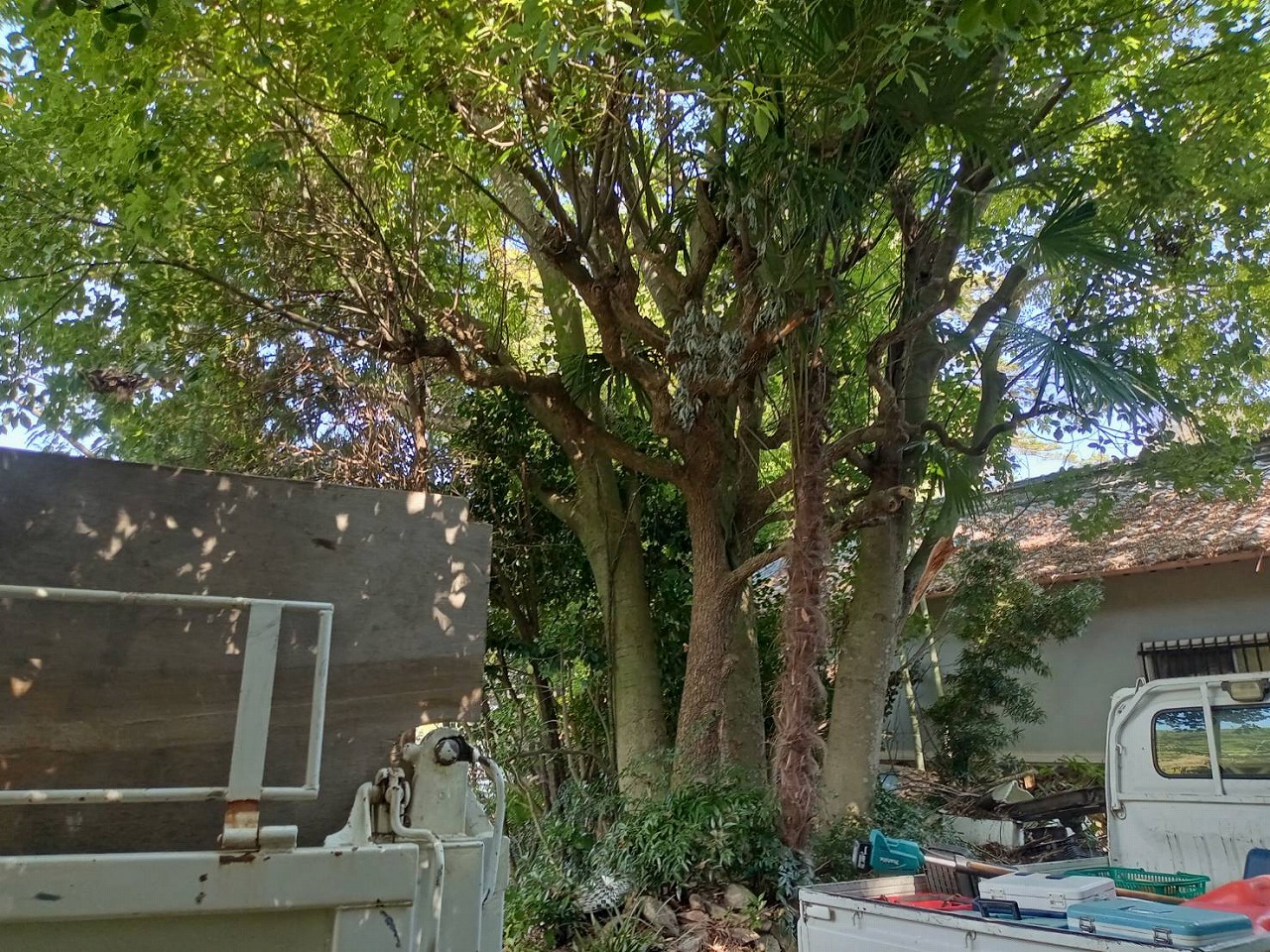 西側の壁上部からはみ出した枝葉の伐採が終わりました。