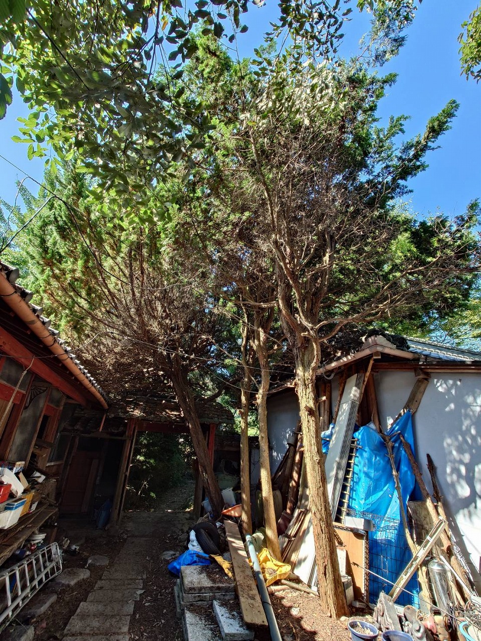 写真で写っているのが幹径50cm前後樹高15mクラスが4本。周囲に幹径10~20cmの低木が10本ぐらいあり全て伐採します。