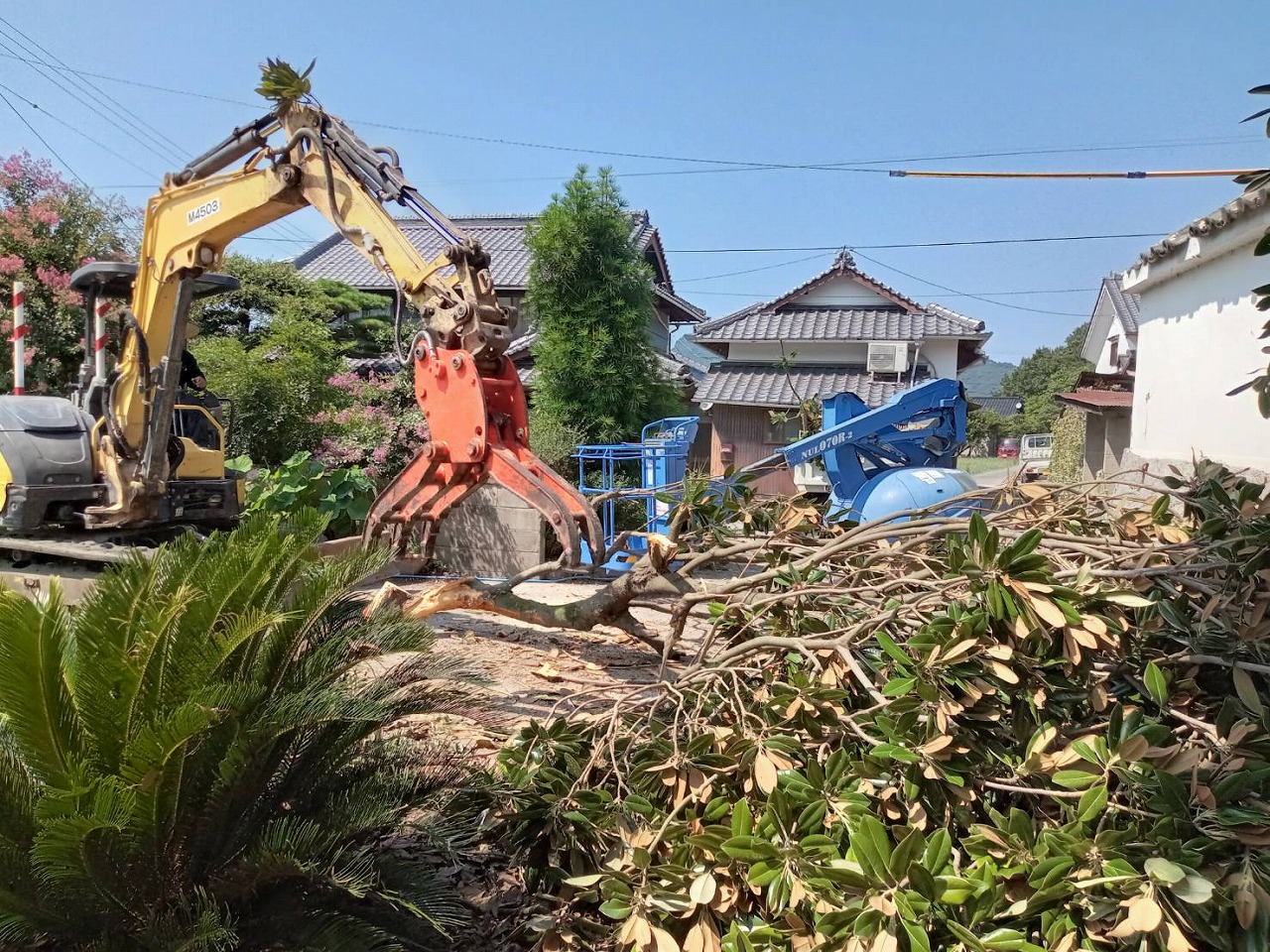 倒す方向を確実に調整して重機を併用しながら慎重に安全に倒していきます。